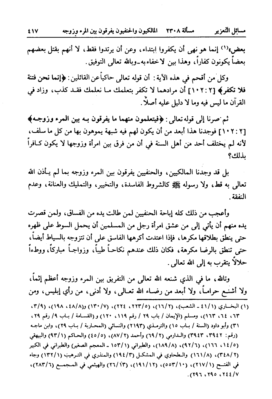 ثُمَّ صِرْنَا إلَى قَوْله تَعَالَى: {فَيَتَعَلَّمُونَ مِنْهُمَا مَا يُفَرِّقُونَ بِهِ بَيْنَ الْمَرْءِ وَزَوْجِهِ} [البقرة: 102] فَوَجَدْنَا هَذَا أَبْعَدَ مِنْ أَنْ يَكُونَ لَهُمْ فِيهِ شُبْهَةٌ يُمَوِّهُونَ بِهَا مِنْ كُلِّ مَا سَلَفَ، لِأَنَّهُ لَمْ يَخْتَلِفْ أَحَدٌ مِنْ أَهْلِ السُّنَّةِ فِي أَنَّ مَنْ فَرَّقَ بَيْنَ امْرَأَةٍ وَزَوْجِهَا لَا يَكُونُ كَافِرًا بِذَلِكَ؟ بَلْ قَدْ وَجَدْنَا الْمَالِكِيِّينَ، وَالْحَنَفِيِّينَ يُفَرِّقُونَ بَيْنَ الْمَرْءِ وَزَوْجِهِ بِمَا لَمْ يَأْذَنْ اللَّهُ تَعَالَى بِهِ قَطُّ، وَلَا رَسُولُهُ - صَلَّى اللَّهُ عَلَيْهِ وَسَلَّمَ - كَالشُّرُوطِ الْفَاسِدَةِ، وَالتَّخْيِيرِ، وَالتَّمْلِيكِ وَالْعِنَانَةِ، وَعَدَمِ النَّفَقَةِ.