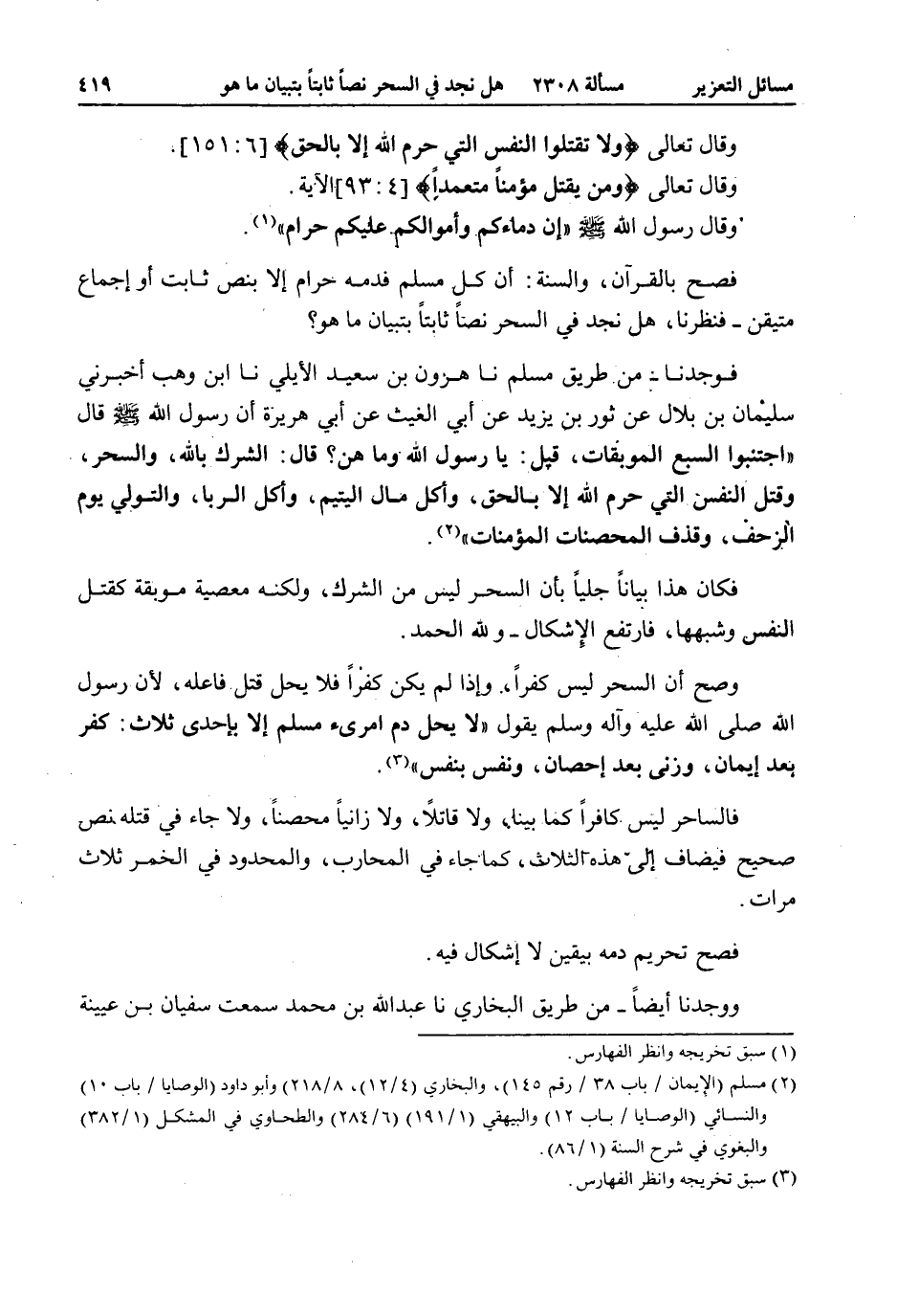 فَصَحَّ بِالْقُرْآنِ وَالسُّنَّةِ: أَنَّ كُلَّ مُسْلِمٍ فَدَمُهُ حَرَامٌ إلَّا بِنَصٍّ ثَابِتٍ أَوْ إجْمَاعٍ مُتَيَقِّنٍ - فَنَظَرْنَا هَلْ نَجِدُ فِي السِّحْرِ نَصًّا ثَابِتًا بِتِبْيَانٍ مَا هُوَ؟ فَوَجَدْنَا - مِنْ طَرِيق مُسْلِمٍ نا هَارُونُ بْنُ سَعِيدٍ الْأَيْلِيُّ نا ابْنُ وَهْبٍ أَخْبَرَنِي سُلَيْمَانُ بْنُ بِلَالٍ عَنْ ثَوْرِ بْنِ يَزِيدَ عَنْ أَبِي الْغَيْثِ عَنْ أَبِي هُرَيْرَةَ أَنَّ رَسُولَ اللَّهِ - صَلَّى اللَّهُ عَلَيْهِ وَسَلَّمَ - قَالَ: «اجْتَنِبُوا السَّبْعَ الْمُوبِقَاتِ، قِيلَ: يَا رَسُولَ اللَّهِ وَمَا هُنَّ؟ قَالَ: الشِّرْكُ بِاَللَّهِ، وَالسِّحْرُ، وَقَتْلُ النَّفْسِ الَّتِي حَرَّمَ اللَّهُ إلَّا بِالْحَقِّ، وَأَكْلُ مَالِ الْيَتِيمِ، وَأَكْلُ الرِّبَا، وَالتَّوَلِّي يَوْمَ الزَّحْفِ، وَقَذْفُ الْمُحْصَنَاتِ الْمُؤْمِنَاتِ» .