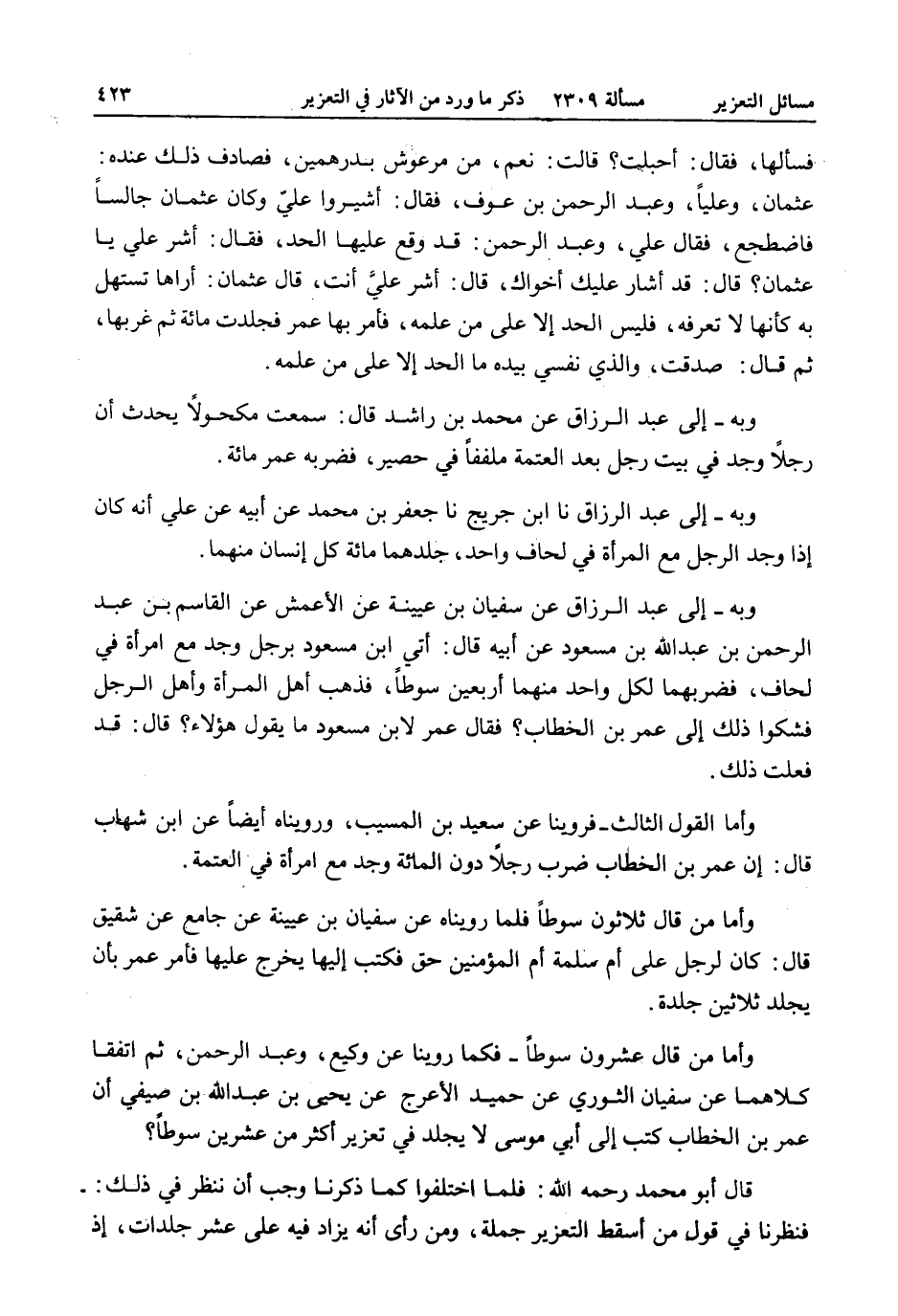 وَأَمَّا مَنْ قَالَ عِشْرُونَ سَوْطًا - فَكَمَا رُوِّينَا عَنْ وَكِيعٍ، وَعَبْدِ الرَّحْمَنِ، ثُمَّ اتَّفَقَا كِلَاهُمَا عَنْ سُفْيَانَ الثَّوْرِيِّ عَنْ حُمَيْدٍ الْأَعْرَجِ عَنْ يَحْيَى بْنِ عَبْدِ اللَّهِ بْنِ صَيْفِيٍّ أَنَّ عُمَرَ بْنَ الْخَطَّابِ كَتَبَ إلَى أَبِي مُوسَى لَا يُجْلَدْ فِي تَعْزِيرٍ أَكْثَرُ مِنْ عِشْرِينَ سَوْطًا؟ قَالَ أَبُو مُحَمَّدٍ - رَحِمَهُ اللَّهُ -: فَلَمَّا اخْتَلَفُوا كَمَا ذَكَرْنَا وَجَبَ أَنْ نَنْظُرَ فِي ذَلِكَ: - فَنَظَرْنَا فِي قَوْلِ مَنْ أَسْقَطَ التَّعْزِيرَ جُمْلَةً، وَمَنْ رَأَى أَنَّهُ يُزَادُ فِيهِ عَشْرُ جَلَدَاتٍ، إذْ