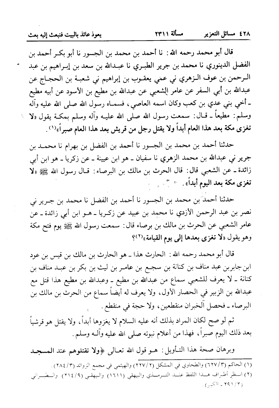 قَالَ أَبُو مُحَمَّدٍ - رَحِمَهُ اللَّهُ -: نا أَحْمَدُ بْنُ مُحَمَّدِ بْنِ الْجَسُورِ نا أَبُو بَكْرٍ أَحْمَدُ بْنُ الْفَضْلِ الدِّينَوَرِيُّ نا مُحَمَّدُ بْنُ جَرِيرٍ الطَّبَرِيُّ نا عَبْدُ اللَّهِ بْنُ سَعْدِ بْنِ إبْرَاهِيمَ بْنِ عَبْدِ الرَّحْمَنِ بْنِ عَوْفٍ الزُّهْرِيُّ ني عَمِّي يَعْقُوبُ بْنُ إبْرَاهِيمَ ني شُعْبَةُ بْنُ الْحَجَّاجِ عَنْ عَبْدِ اللَّهِ بْنِ أَبِي السَّفَرِ عَنْ عَامِرٍ الشَّعْبِيِّ عَنْ عَبْدِ اللَّهِ بْنِ مُطِيعِ بْنِ الْأَسْوَدِ عَنْ أَبِيهِ مُطِيعٍ - أَخِي بَنِي عَدِيِّ بْنِ كَعْبٍ وَكَانَ اسْمُهُ الْعَاصِ، فَسَمَّاهُ رَسُولُ اللَّهِ - صَلَّى اللَّهُ عَلَيْهِ وَآلِهِ وَسَلَّمَ -: مُطِيعًا - قَالَ: سَمِعْت رَسُولَ اللَّهِ - صَلَّى اللَّهُ عَلَيْهِ وَآلِهِ وَسَلَّمَ - بِمَكَّةَ يَقُولُ «لَا تُغْزَى مَكَّةُ بَعْدَ هَذَا الْعَامِ أَبَدًا وَلَا يُقْتَلُ رَجُلٌ مِنْ قُرَيْشٍ بَعْدَ هَذَا الْعَامِ صَبْرًا» .