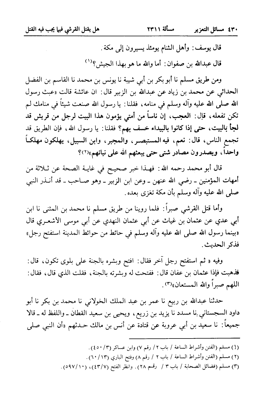 قَالَ عَبْدُ اللَّهِ بْنُ صَفْوَانَ: أَمَا وَاَللَّهِ مَا هُوَ بِهَذَا الْجَيْشِ؟ وَمِنْ طَرِيقِ مُسْلِمٍ نا أَبُو بَكْرِ بْنُ أَبِي شَيْبَةَ نا يُونُسُ بْنُ مُحَمَّدٍ نا الْقَاسِمُ بْنُ الْفَضْلِ الْحُدَّانِيُّ عَنْ مُحَمَّدِ بْنِ زِيَادٍ عَنْ عَبْدِ اللَّهِ بْنِ الزُّبَيْرِ قَالَ: إنَّ عَائِشَةَ قَالَتْ «عَبَثَ رَسُولُ اللَّهِ - صَلَّى اللَّهُ عَلَيْهِ وَآلِهِ وَسَلَّمَ - فِي مَنَامِهِ، فَقُلْنَا: يَا رَسُولَ اللَّهِ صَنَعْتُ شَيْئًا فِي مَنَامِكَ لَمْ تَكُنْ تَفْعَلُهُ، قَالَ: الْعَجَبُ، إنَّ نَاسًا مِنْ أُمَّتِي يَؤُمُّونَ هَذَا الْبَيْتَ لِرَجُلٍ مِنْ قُرَيْشٍ قَدْ لَجَأَ بِالْبَيْتِ، حَتَّى إذَا كَانُوا بِالْبَيْدَاءِ خُسِفَ بِهِمْ؟ فَقُلْنَا: يَا رَسُولَ اللَّهِ، فَإِنَّ الطَّرِيقَ قَدْ تَجْمَعُ النَّاسُ، قَالَ: نَعَمْ، فِيهِ الْمُسْتَبْصِرُ، وَالْمُجْبَرُ، وَابْنُ السَّبِيلِ، يَهْلِكُونَ مَهْلَكًا وَاحِدًا، وَيُصْدَرُونَ مَصَادِرَ شَتَّى حَتَّى يَبْعَثَهُمْ اللَّهُ عَلَى نِيَّاتِهِمْ» .؟ قَالَ أَبُو مُحَمَّدٍ - رَحِمَهُ اللَّهُ -: فَهَذَا خَبَرٌ صَحِيحٌ فِي غَايَةِ الصِّحَّةِ عَنْ ثَلَاثَةٍ مِنْ أُمَّهَاتِ الْمُؤْمِنِينَ - رَضِيَ اللَّهُ عَنْهُنَّ - وَعَنْ ابْنِ الزُّبَيْرِ - وَهُوَ صَاحِبُ - قَدْ «أَنْذَرَ النَّبِيُّ - صَلَّى اللَّهُ عَلَيْهِ وَآلِهِ وَسَلَّمَ - بِأَنَّ مَكَّةَ تُغْزَى بَعْدَهُ» .