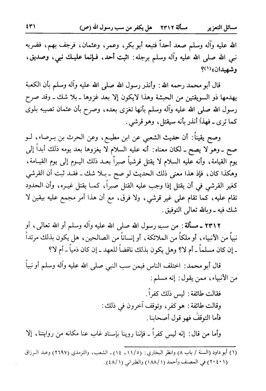 2312 - مَسْأَلَةٌ: مَنْ سَبَّ رَسُولَ اللَّهِ - صَلَّى اللَّهُ عَلَيْهِ وَآلِهِ وَسَلَّمَ - أَوْ اللَّهَ تَعَالَى، أَوْ نَبِيًّا مِنْ الْأَنْبِيَاءِ، أَوْ مَلَكًا مِنْ الْمَلَائِكَةِ، أَوْ إنْسَانًا مِنْ الصَّالِحِينَ، هَلْ يَكُونُ بِذَلِكَ مُرْتَدًّا - إنْ كَانَ مُسْلِمًا - أَمْ لَا؟ وَهَلْ يَكُونُ بِذَلِكَ نَاقِضًا لِلْعَهْدِ - إنْ كَانَ ذِمِّيًّا - أَمْ لَا؟ قَالَ أَبُو مُحَمَّدٍ: اخْتَلَفَ النَّاسُ فِيمَنْ سَبَّ النَّبِيَّ - صَلَّى اللَّهُ عَلَيْهِ وَآلِهِ وَسَلَّمَ - أَوْ نَبِيًّا مِنْ الْأَنْبِيَاءِ، مِمَّنْ يَقُولُ: إنَّهُ مُسْلِمٌ: فَقَالَتْ طَائِفَةٌ: لَيْسَ ذَلِكَ كُفْرًا.