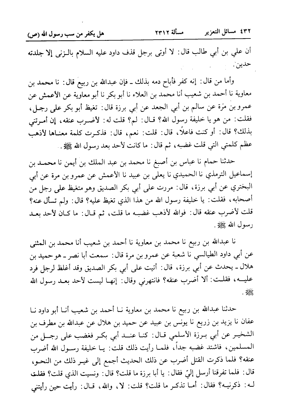 وَأَمَّا مَنْ قَالَ: إنَّهُ كُفْرٌ فَأَبَاحَ دَمَهُ بِذَلِكَ - فَإِنَّ عَبْدَ اللَّهِ بْنَ رَبِيعٍ قَالَ: نا مُحَمَّدُ بْنُ مُعَاوِيَةَ نا أَحْمَدُ بْنُ شُعَيْبٍ أَنَا مُحَمَّدُ بْنُ الْعَلَاءِ نا أَبُو بَكْرٍ نا أَبُو مُعَاوِيَةَ عَنْ الْأَعْمَشِ عَنْ عَمْرِو بْنِ مُرَّةَ عَنْ سَالِمِ بْنِ أَبِي الْجَعْدِ عَنْ أَبِي بَرْزَةَ قَالَ: تَغَيَّظَ أَبُو بَكْرٍ عَلَى رَجُلٍ، فَقُلْت: مَنْ هُوَ يَا خَلِيفَةَ رَسُولِ اللَّهِ؟ قَالَ: لِمَ؟ قُلْت لَهُ: لِأَضْرِبَ عُنُقَهُ، إنْ أَمَرَتْنِي بِذَلِكَ؟ قَالَ: أَوَ كُنْت فَاعِلًا، قَالَ: قُلْت: نَعَمْ، قَالَ: فَذَكَرْت كَلِمَةً مَعْنَاهَا لَأَذْهَبَ عِظَمُ كَلِمَتِي الَّتِي قُلْت غَضَبَهُ، ثُمَّ قَالَ: مَا كَانَتْ لِأَحَدٍ بَعْدَ رَسُولِ اللَّهِ - صَلَّى اللَّهُ عَلَيْهِ وَسَلَّمَ -.