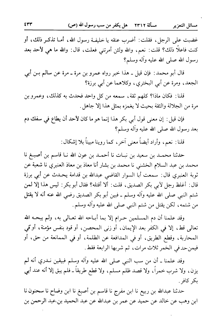 فَإِنْ قِيلَ: إنَّ مَعْنَى قَوْلِ أَبِي بَكْرٍ هَذَا إنَّمَا هُوَ مَا كَانَ لِأَحَدٍ أَنْ يُطَاعَ فِي سَفْكِ دَمٍ بَعْدَ رَسُولِ اللَّهِ - صَلَّى اللَّهُ عَلَيْهِ وَآلِهِ وَسَلَّمَ -؟ قُلْنَا نَعَمْ، وَأَرَادَ أَيْضًا مَعْنًى آخَرَ، كَمَا رُوِّينَا مُبَيَّنًا بِلَا إشْكَالٍ: حَدَّثَنَا مُحَمَّدُ بْنُ سَعِيدِ بْنِ نُبَاتٍ نا أَحْمَدُ بْنُ عَوْنِ اللَّهِ نا قَاسِمُ بْنُ أَصْبَغَ نا مُحَمَّدُ بْنُ عَبْدِ السَّلَامِ الْخُشَنِيُّ نا مُحَمَّدُ بْنُ بَشَّارٍ أَنَا مُعَاذُ بْنُ مُعَاذٍ الْعَنْبَرِيُّ نا شُعْبَةُ عَنْ ثَوْبَةَ الْعَنْبَرِيِّ قَالَ: سَمِعْت أَبَا السَّوَّارِ الْقَاضِي عَبْدَ اللَّهِ بْنَ قُدَامَةَ يُحَدِّثُ عَنْ أَبِي بَرْزَةَ قَالَ: أَغْلَظَ رَجُلٌ لِأَبِي بَكْرٍ الصِّدِّيقِ، قُلْت: أَلَا أَقْتُلُهُ؟ فَقَالَ أَبُو بَكْرٍ: لَيْسَ هَذَا إلَّا لِمَنْ شَتَمَ النَّبِيَّ - صَلَّى اللَّهُ عَلَيْهِ وَآلِهِ وَسَلَّمَ - فَبَيَّنَ أَبُو بَكْرٍ الصِّدِّيقُ - رَضِيَ اللَّهُ عَنْهُ - أَنَّهُ لَا يُقْتَلُ مَنْ شَتَمَهُ، لَكِنْ يُقْتَلُ مَنْ شَتَمَ النَّبِيَّ - صَلَّى اللَّهُ عَلَيْهِ وَآلِهِ وَسَلَّمَ -.