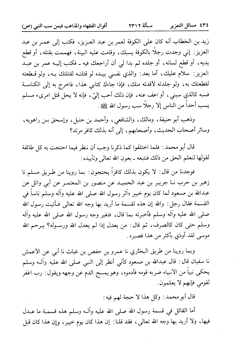 وَذَهَبَ أَبُو حَنِيفَةَ، وَمَالِكٌ، وَالشَّافِعِيُّ، وَأَحْمَدُ بْنُ حَنْبَلٍ، وَإِسْحَاقُ بْنُ رَاهْوَيْهِ، وَسَائِرُ أَصْحَابِ الْحَدِيثِ، وَأَصْحَابُهُمْ، إلَى أَنَّهُ بِذَلِكَ كَافِرٌ مُرْتَدٌّ؟ قَالَ أَبُو مُحَمَّدٍ: فَلَمَّا اخْتَلَفُوا كَمَا ذَكَرْنَا وَجَبَ أَنْ نَنْظُرَ فِيمَا احْتَجَّتْ بِهِ كُلُّ طَائِفَةٍ لِقَوْلِهَا لِنَعْلَمَ الْحَقَّ مِنْ ذَلِكَ فَنَتَّبِعَهُ - بِعَوْنِ اللَّهِ تَعَالَى وَتَأْيِيدِهِ. فَوَجَدْنَا مَنْ قَالَ: لَا يَكُونُ بِذَلِكَ كَافِرًا يَحْتَجُّونَ بِمَا رُوِّينَا مِنْ طَرِيقِ مُسْلِمٍ نا زُهَيْرُ بْنُ حَرْبٍ نا جَرِيرُ بْنُ عَبْدِ الْحَمِيدِ عَنْ مَنْصُورِ بْنِ الْمُعْتَمِرِ عَنْ أَبِي وَائِلٍ عَنْ عَبْدِ اللَّهِ بْنِ مَسْعُودٍ لَمَّا كَانَ يَوْمُ خَيْبَرَ «آثَرَ رَسُولُ اللَّهِ - صَلَّى اللَّهُ عَلَيْهِ وَآلِهِ وَسَلَّمَ - نَاسًا فِي الْقِسْمَةِ فَقَالَ رَجُلٌ: وَاَللَّهِ إنَّ هَذِهِ لَقِسْمَةٌ مَا أُرِيدَ بِهَا وَجْهُ اللَّهِ تَعَالَى فَأَتَيْتُ رَسُولَ اللَّهِ - صَلَّى اللَّهُ عَلَيْهِ وَآلِهِ وَسَلَّمَ - فَأَخْبَرْتُهُ بِمَا قَالَ، فَتَغَيَّرَ وَجْهُ رَسُولِ اللَّهِ - صَلَّى اللَّهُ عَلَيْهِ وَآلِهِ وَسَلَّمَ - حَتَّى كَانَ كَالصِّرْفِ، ثُمَّ قَالَ: مَنْ يَعْدِلُ إذَا لَمْ يَعْدِلْ اللَّهُ وَرَسُولُهُ؟ يَرْحَمُ اللَّهُ مُوسَى لَقَدْ أُوذِيَ بِأَكْثَرَ مِنْ هَذَا فَصَبَرَ» .