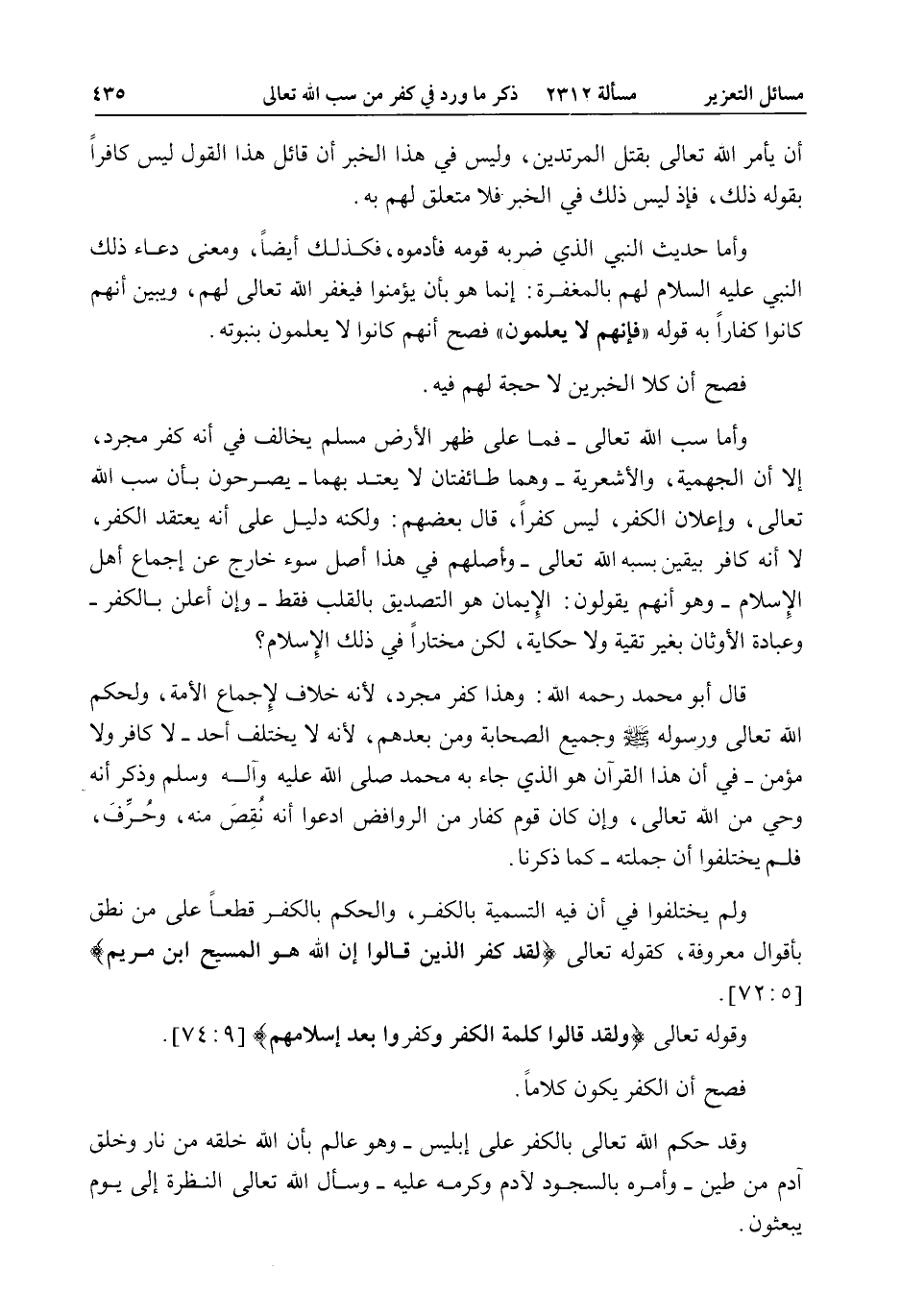 وَأَمَّا سَبُّ اللَّهِ تَعَالَى - فَمَا عَلَى ظَهْرِ الْأَرْضِ مُسْلِمٌ يُخَالِفُ فِي أَنَّهُ كُفْرٌ مُجَرَّدٌ، إلَّا أَنَّ الْجَهْمِيَّةَ، وَالْأَشْعَرِيَّةَ - وَهُمَا طَائِفَتَانِ لَا يُعْتَدُّ بِهِمَا - يُصَرِّحُونَ بِأَنَّ سَبَّ اللَّهِ تَعَالَى، وَإِعْلَانَ الْكُفْرِ، لَيْسَ كُفْرًا، قَالَ بَعْضُهُمْ: وَلَكِنَّهُ دَلِيلٌ عَلَى أَنَّهُ يَعْتَقِدُ الْكُفْرَ، لَا أَنَّهُ كَافِرٌ بِيَقِينٍ بِسَبِّهِ اللَّهَ تَعَالَى - وَأَصْلُهُمْ فِي هَذَا أَصْلُ سُوءٍ خَارِجٌ عَنْ إجْمَاعِ أَهْلِ الْإِسْلَامِ - وَهُوَ أَنَّهُمْ يَقُولُونَ: الْإِيمَانُ هُوَ التَّصْدِيقُ بِالْقَلْبِ فَقَطْ - وَإِنْ أَعْلَنَ بِالْكُفْرِ - وَعِبَادَةُ الْأَوْثَانِ بِغَيْرِ تَقِيَّةٍ وَلَا حِكَايَةٍ، لَكِنْ مُخْتَارًا فِي ذَلِكَ الْإِسْلَامَ. قَالَ أَبُو مُحَمَّدٍ - رَحِمَهُ اللَّهُ -: وَهَذَا كُفْرٌ مُجَرَّدٌ؛ لِأَنَّهُ خِلَافٌ لِإِجْمَاعِ الْأُمَّةِ، وَلِحُكْمِ اللَّهِ تَعَالَى وَرَسُولِهِ - صَلَّى اللَّهُ عَلَيْهِ وَسَلَّمَ - وَجَمِيعِ الصَّحَابَةِ وَمَنْ بَعْدَهُمْ؛ لِأَنَّهُ لَا يَخْتَلِفُ أَحَدٌ - لَا كَافِرٌ وَلَا مُؤْمِنٌ - فِي أَنَّ هَذَا الْقُرْآنَ هُوَ الَّذِي جَاءَ بِهِ مُحَمَّدُ - صَلَّى اللَّهُ عَلَيْهِ وَآلِهِ وَسَلَّمَ - وَذَكَرَ أَنَّهُ وَحْيٌ مِنْ اللَّهِ تَعَالَى، وَإِنْ كَانَ قَوْمٌ مِنْ الرَّوَافِضِ ادَّعُوا أَنَّهُ نُقِصَ مِنْهُ، وَحُرِّفَ، فَلَمْ يَخْتَلِفُوا أَنَّ جُمْلَتَهُ - كَمَا ذَكَرْنَا.