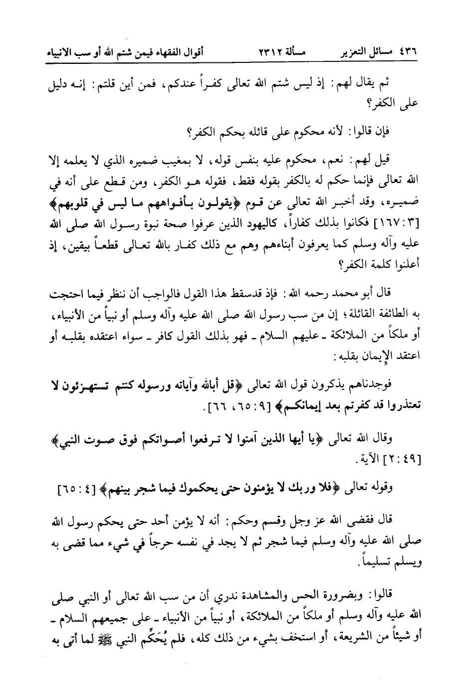 قَالُوا: وَبِضَرُورَةِ الْحِسِّ وَالْمُشَاهَدَةِ نَدْرِي أَنَّ مَنْ سَبَّ اللَّهَ تَعَالَى أَوْ النَّبِيَّ - صَلَّى اللَّهُ عَلَيْهِ وَآلِهِ وَسَلَّمَ - أَوْ مَلَكًا مِنْ الْمَلَائِكَةِ، أَوْ نَبِيًّا مِنْ الْأَنْبِيَاءِ - عَلَى جَمِيعِهِمْ السَّلَامُ - أَوْ شَيْئًا مِنْ الشَّرِيعَةِ، أَوْ اسْتَخَفَّ بِشَيْءٍ مِنْ ذَلِكَ كُلِّهِ، فَلَمْ يُحَكِّمْ النَّبِيَّ - صَلَّى اللَّهُ عَلَيْهِ وَسَلَّمَ - لِمَا أَتَى بِهِ