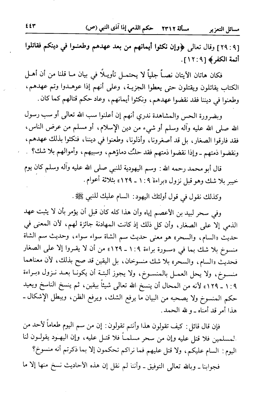 وَكَذَلِكَ نَقُولُ فِي قَوْلِ أُولَئِكَ الْيَهُودِ: السَّامُ عَلَيْك لِلنَّبِيِّ - صَلَّى اللَّهُ عَلَيْهِ وَسَلَّمَ -. وَفِي سِحْرِ لَبِيدِ بْنِ الْأَعْصَمِ إيَّاهُ وَأَنَّ هَذَا كُلَّهُ كَانَ قَبْلَ أَنْ يُؤْمَرَ بِأَنْ لَا يُثَبِّتَ عَهْدَ الذِّمِّيِّ إلَّا عَلَى الصِّغَارِ، وَأَنَّ كُلَّ ذَلِكَ إذْ كَانَتْ الْمُهَادَنَةُ جَائِزَةً لَهُمْ؛ لِأَنَّ الْمَعْنَى فِي حَدِيثِ " السَّامِ، وَالسِّحْرِ " هُوَ مَعْنَى حَدِيثِ سَمِّ الشَّاةِ سَوَاءً سَوَاءً، وَحَدِيثُ سَمِّ الشَّاةِ مَنْسُوخٌ بِلَا شَكٍّ بِمَا فِي " سُورَةِ بَرَاءَةَ " مِنْ أَنْ لَا يُقَرُّوا إلَّا عَلَى الصِّغَارِ فَحَدِيثُ " السَّامِ، وَالسِّحْرِ " بِلَا شَكٍّ مَنْسُوخَانِ، بَلْ الْيَقِينُ قَدْ صَحَّ بِذَلِكَ؛ لِأَنَّ مَعْنَاهُمَا مَنْسُوخٌ وَلَا يَحِلُّ الْعَمَلُ بِالْمَنْسُوخِ، وَلَا يَجُوزُ أَلْبَتَّةَ أَنْ يَكُونَا بَعْدَ نُزُولِ " بَرَاءَةٌ "؛ لِأَنَّهُ مِنْ الْمُحَالِ أَنْ يَنْسَخَ اللَّهُ تَعَالَى شَيْئًا بِيَقِينٍ، ثُمَّ يَنْسَخَ النَّاسِخَ وَيُعِيدَ حُكْمَ الْمَنْسُوخِ وَلَا يَصْحَبَهُ مِنْ الْبَيَانِ مَا يَرْفَعُ الشَّكَّ، وَيَرْفَعُ الظَّنَّ، وَيُبْطِلُ الْإِشْكَالَ - هَذَا أَمْرٌ قَدْ أَمِنَّاهُ - وَلِلَّهِ الْحَمْدُ.