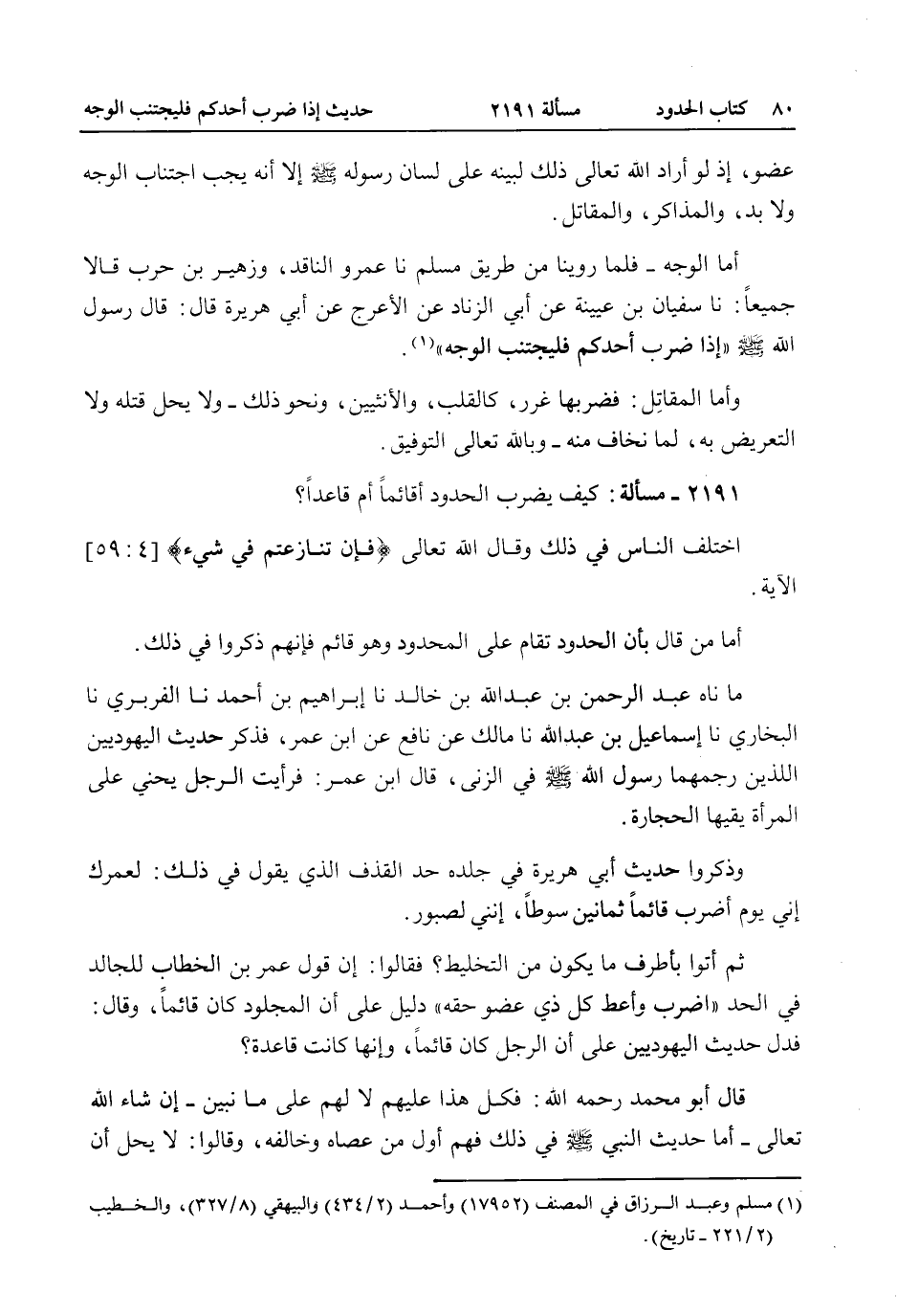 2191 - مَسْأَلَةٌ: كَيْف يُضْرَبُ الْحُدُودَ أَقَائِمًا أَمْ قَاعِدًا؟ اخْتَلَفَ النَّاسُ فِي ذَلِكَ وَقَالَ اللَّهُ تَعَالَى {فَإِنْ تَنَازَعْتُمْ فِي شَيْءٍ} [النساء: 59] الْآيَةَ