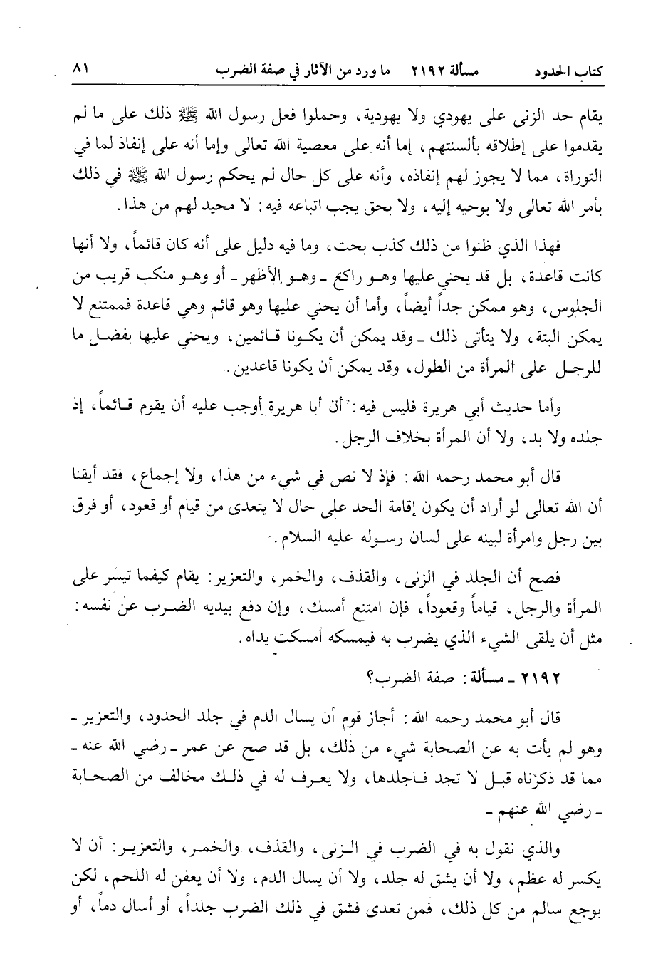 2192 - مَسْأَلَةٌ: صِفَةُ الضَّرْبِ؟ قَالَ أَبُو مُحَمَّدٍ - رَحِمَهُ اللَّهُ -: أَجَازَ قَوْمٌ أَنْ يُسَالَ الدَّمُ فِي جَلْدِ الْحُدُودِ، وَالتَّعْزِيرِ - وَهُوَ لَمْ يَأْتِ بِهِ عَنْ الصَّحَابَةِ شَيْءٌ مِنْ ذَلِكَ، بَلْ قَدْ صَحَّ عَنْ عُمَرَ - رَضِيَ اللَّهُ عَنْهُ - مِمَّا قَدْ ذَكَرْنَاهُ قَبْلُ لَا تَجِدُ، فَاجْلِدْهَا، وَلَا يُعْرَفُ لَهُ فِي ذَلِكَ مُخَالِفٌ مِنْ الصَّحَابَةِ - رَضِيَ اللَّهُ عَنْهُمْ - وَاَلَّذِي نَقُولُ بِهِ فِي الضَّرْبِ فِي الزِّنَى، وَالْقَذْفِ، وَالْخَمْرِ، وَالتَّعْزِيرِ: أَنْ لَا يُكْسَرَ لَهُ عَظْمٌ، وَلَا أَنْ يُشَقَّ لَهُ جِلْدٌ، وَلَا أَنْ يُسَالَ الدَّمُ، وَلَا أَنْ يَعْفَنَ لَهُ اللَّحْمُ، لَكِنْ بِوَجَعٍ سَالِمٍ مِنْ كُلِّ ذَلِكَ، فَمَنْ تَعَدَّى فَشَقَّ فِي ذَلِكَ الضَّرْبِ جِلْدًا، أَوْ أَسَالَ دَمًا، أَوْ
