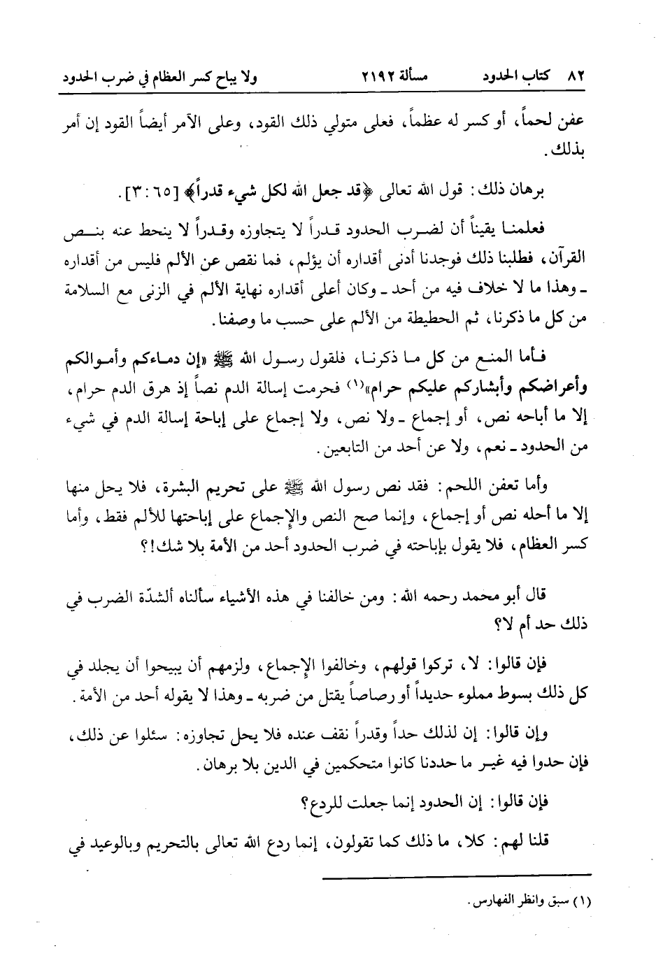 قَالَ أَبُو مُحَمَّدٍ - رَحِمَهُ اللَّهُ -: وَمَنْ خَالَفَنَا فِي هَذِهِ الْأَشْيَاءِ سَأَلْنَاهُ أَلِشِدَّةِ الضَّرْبِ فِي ذَلِكَ حَدٌّ أَمْ لَا؟ فَإِنْ قَالُوا: لَا، تَرَكُوا قَوْلَهُمْ، وَخَالَفُوا الْإِجْمَاعَ، وَلَزِمَهُمْ أَنْ يُبِيحُوا أَنْ يُجْلَدَ فِي كُلِّ ذَلِكَ بِسَوْطٍ مَمْلُوءٍ حَدِيدًا أَوْ رَصَاصًا يُقْتَلُ مَنْ ضَرَبَهُ - وَهَذَا لَا يَقُولُهُ أَحَدٌ مِنْ الْأُمَّةِ