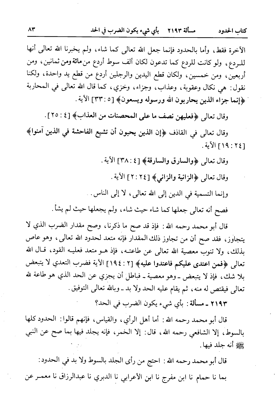قَالَ أَبُو مُحَمَّدٍ - رَحِمَهُ اللَّهُ -: احْتَجَّ مَنْ رَأَى الْجَلْدَ بِالسَّوْطِ وَلَا بُدَّ فِي الْحُدُودِ: بِمَا أَنَا حُمَامٌ أَنَا ابْنُ مُفَرِّجٍ أَنَا ابْنُ الْأَعْرَابِيِّ أَنَا الدَّبَرِيُّ أَنَا عَبْدُ الرَّزَّاقِ أَنَا مَعْمَرٌ عَنْ