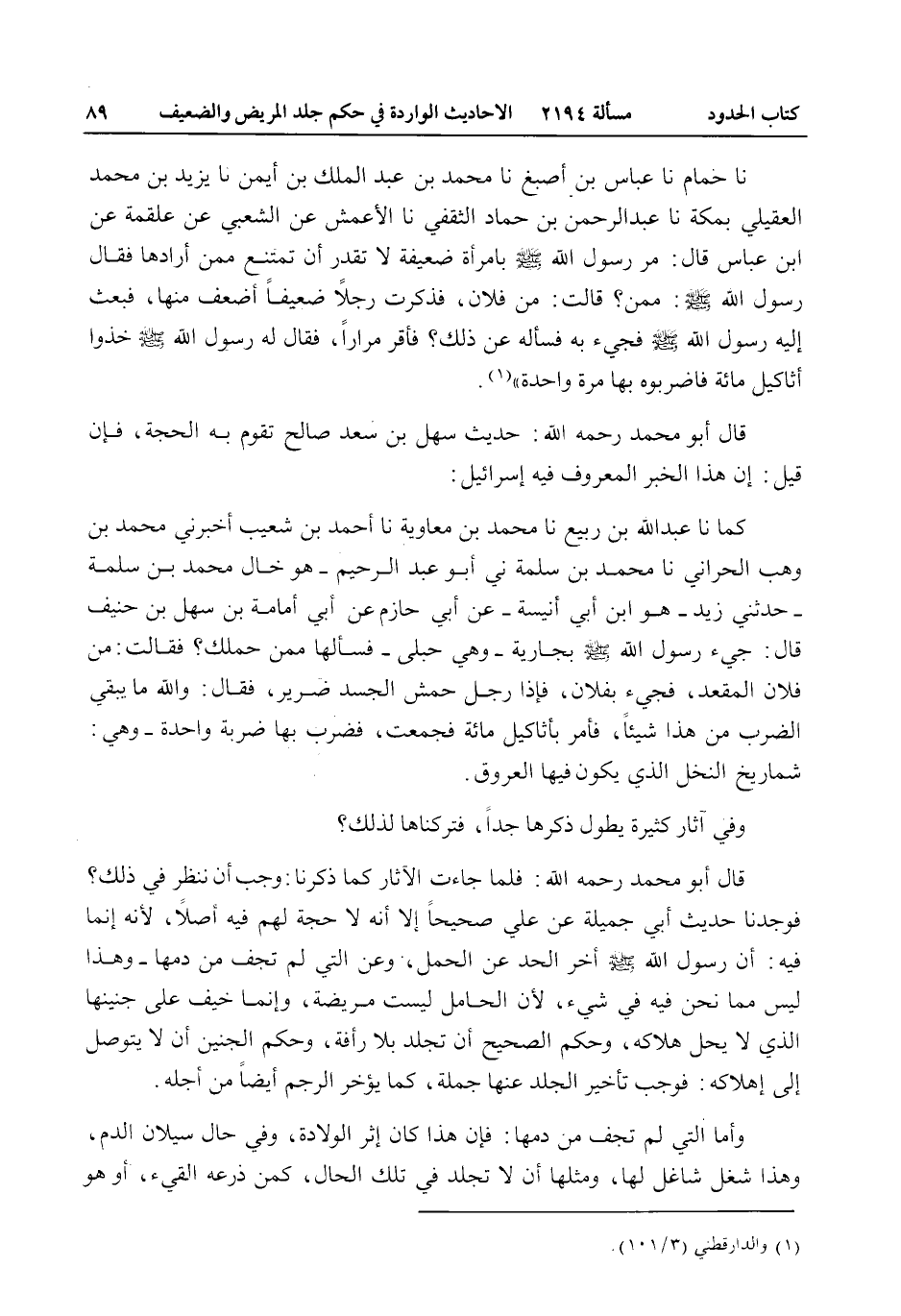 قَالَ أَبُو مُحَمَّدٍ - رَحِمَهُ اللَّهُ -: حَدِيثُ سَهْلِ بْنِ سَعْدٍ صَالِحٍ تَقُومُ بِهِ الْحُجَّةُ، فَإِنْ قِيلَ: إنَّ هَذَا الْخَبَرَ الْمَعْرُوفَ فِيهِ إسْرَائِيلُ: كَمَا أَنَا عَبْدُ اللَّهِ بْنُ رَبِيعٍ أَنَا مُحَمَّدُ بْنُ مُعَاوِيَةَ أَنَا أَحْمَدُ بْنُ شُعَيْبٍ أَخْبَرَنِي مُحَمَّدُ بْنُ وَهْبٍ الْحَرَّانِيُّ أَنَا مُحَمَّدُ بْنُ سَلَمَةَ ني أَبُو عَبْدِ الرَّحِيمِ - هُوَ خَالُ مُحَمَّدِ بْنِ سَلَمَةَ - حَدَّثَنِي زَيْدٌ - هُوَ ابْنُ أَبِي أُنَيْسَةَ - عَنْ أَبِي حَازِمٍ عَنْ أَبِي أُمَامَةَ بْنِ سَهْلِ بْنِ حُنَيْفٍ قَالَ: «جِيءَ رَسُولُ اللَّهِ - صَلَّى اللَّهُ عَلَيْهِ وَسَلَّمَ - بِجَارِيَةٍ - وَهِيَ حُبْلَى - فَسَأَلَهَا مِمَّنْ حَمْلُكِ؟ فَقَالَتْ: مِنْ فُلَانٍ الْمُقْعَدِ، فَجِيءَ بِفُلَانٍ، فَإِذَا رَجُلٌ حَمْشُ الْجَسَدِ ضَرِيرٌ، فَقَالَ: وَاَللَّهِ مَا يُبْقِي الضَّرْبُ مِنْ هَذَا شَيْئًا، فَأَمَرَ بِأَثَاكِيلَ مِائَةً فَجُمِعَتْ، فَضُرِبَ بِهَا ضَرْبَةً وَاحِدَةً» وَهِيَ: شَمَارِيخُ النَّخْلِ الَّذِي يَكُونُ فِيهَا الْعُرُوقُ