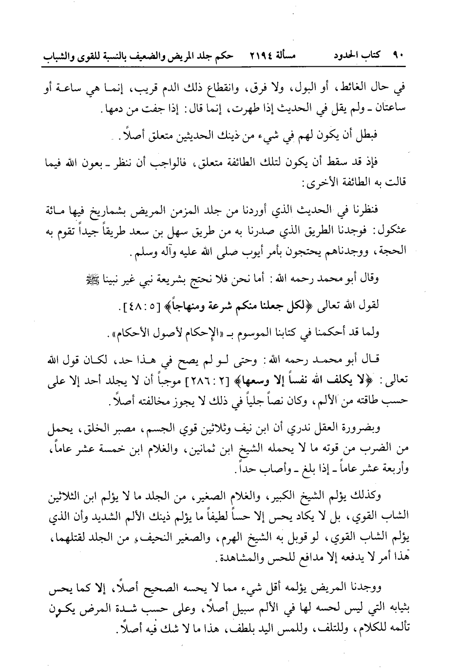 قَالَ أَبُو مُحَمَّدٍ - رَحِمَهُ اللَّهُ -: وَحَتَّى لَوْ لَمْ يَصِحَّ فِي هَذَا حَدٌّ، لَكَانَ قَوْلُ اللَّهِ تَعَالَى: {لا يُكَلِّفُ اللَّهُ نَفْسًا إِلا وُسْعَهَا} [البقرة: 286] مُوجِبًا أَنْ لَا يُجْلَدَ أَحَدٌ إلَّا عَلَى حَسَبِ طَاقَتِهِ مِنْ الْأَلَمِ، وَكَانَ نَصًّا جَلِيًّا فِي ذَلِكَ لَا يَجُوزُ مُخَالَفَتُهُ أَصْلًا.