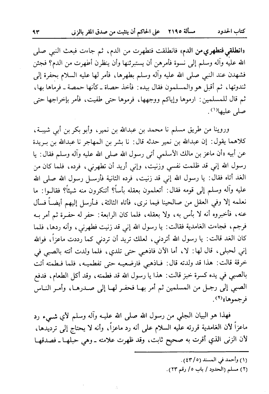 وَرُوِّينَا مِنْ طَرِيقِ مُسْلِمٍ نا مُحَمَّدُ بْنُ عَبْدِ اللَّهِ بْنِ نُمَيْرٍ، وَأَبُو بَكْرِ بْنُ أَبِي شَيْبَةَ، كِلَاهُمَا يَقُولُ: إنَّ عَبْدَ اللَّهِ بْنَ نُمَيْرٍ حَدَّثَهُ قَالَ: أَنَا بِشْرُ بْنُ الْمُهَاجِرِ أَنَا عَبْدُ اللَّهِ بْنُ بُرَيْدَةَ عَنْ أَبِيهِ «أَنَّ مَاعِزَ بْنَ مَالِكٍ الْأَسْلَمِيَّ أَتَى رَسُولَ اللَّهِ - صَلَّى اللَّهُ عَلَيْهِ وَآلِهِ وَسَلَّمَ - فَقَالَ: يَا رَسُولَ اللَّهِ إنِّي قَدْ ظَلَمْت نَفْسِي وَزَنَيْتُ، وَإِنِّي أُرِيدُ أَنْ تُطَهِّرَنِي، فَرَدَّهُ، فَلَمَّا كَانَ مِنْ الْغَدِ أَتَاهُ فَقَالَ: يَا رَسُولَ اللَّهِ إنِّي قَدْ زَنَيْتُ، فَرَدَّهُ الثَّانِيَةَ فَأَرْسَلَ رَسُولُ اللَّهِ - صَلَّى اللَّهُ عَلَيْهِ وَآلِهِ وَسَلَّمَ - إلَى قَوْمِهِ فَقَالَ: أَتَعْلَمُونَ بِعَقْلِهِ بَأْسًا؟ أَتُنْكِرُونَ مِنْهُ شَيْئًا؟ فَقَالُوا: مَا نَعْلَمُهُ إلَّا وَفِي الْعَقْلِ مِنْ صَالِحِينَا فِيمَا نَرَى، فَأَتَاهُ الثَّالِثَةَ، فَأَرْسَلَ إلَيْهِمْ أَيْضًا فَسَأَلَ عَنْهُ، فَأَخْبَرُوهُ أَنَّهُ لَا بَأْسَ بِهِ، وَلَا بِعَقْلِهِ، فَلَمَّا كَانَ الرَّابِعَةَ: حَفَرَ لَهُ حُفْرَةً ثُمَّ أَمَرَ بِهِ فَرُجِمَ، فَجَاءَتْ الْغَامِدِيَّةُ فَقَالَتْ: يَا رَسُولَ اللَّهِ إنِّي قَدْ زَنَيْتُ فَطَهِّرْنِي، وَأَنَّهُ رَدَّهَا، فَلَمَّا كَانَ الْغَدُ قَالَتْ: يَا رَسُولَ اللَّهِ أَتَرُدُّنِي، لَعَلَّكَ تُرِيدُ أَنْ تَرُدَّنِي كَمَا رَدَدْتَ مَاعِزًا، فَوَاَللَّهِ إنِّي لَحُبْلَى، قَالَ لَهَا: لَا، أَمَّا الْآنَ فَاذْهَبِي حَتَّى تَلِدِي، فَلَمَّا وَلَدَتْ أَتَتْهُ بِالصَّبِيِّ فِي خِرْقَةٍ قَالَتْ: هَذَا قَدْ وَلَدْتُهُ قَالَ: فَاذْهَبِي فَأَرْضِعِيهِ حَتَّى تَفْطِمِيهِ، فَلَمَّا فَطَمَتْهُ أَتَتْ بِالصَّبِيِّ فِي يَدِهِ كِسْرَةُ خُبْزٍ قَالَتْ: هَذَا يَا رَسُولَ اللَّهِ قَدْ فَطَمْتُهُ، وَقَدْ أَكَلَ الطَّعَامَ، فَدَفَعَ الصَّبِيَّ إلَى رَجُلٍ مِنْ الْمُسْلِمِينَ ثُمَّ أَمَرَ بِهَا فَحُفِرَ لَهَا إلَى صَدْرِهَا، وَأَمَرَ النَّاسَ فَرَجَمُوهَا»