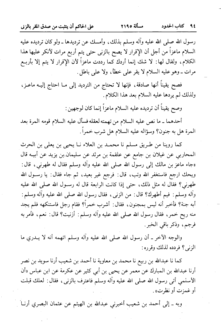 كَمَا رُوِّينَا مِنْ طَرِيقِ مُسْلِمٍ أَنَا مُحَمَّدُ بْنُ الْعَلَاءِ أَنَا يَحْيَى بْنُ يَعْلَى بْنِ الْحَارِثِ الْمُحَارِبِيُّ عَنْ غَيْلَانَ بْنِ جَامِعٍ عَنْ عَلْقَمَةَ بْنِ مَرْثَدٍ عَنْ سُلَيْمَانَ بْنِ يَزِيدَ عَنْ أَبِيهِ قَالَ «جَاءَ مَاعِزُ بْنُ مَالِكٍ إلَى رَسُولِ اللَّهِ - صَلَّى اللَّهُ عَلَيْهِ وَآلِهِ وَسَلَّمَ - فَقَالَ لَهُ طَهِّرْنِي، قَالَ: وَيْحَكَ ارْجِعْ فَاسْتَغْفِرْ اللَّهَ وَتُبْ، قَالَ: فَرَجَعَ غَيْرَ بَعِيدٍ، ثُمَّ جَاءَ فَقَالَ: يَا رَسُولَ اللَّهِ طَهِّرْنِي؟ فَقَالَ لَهُ مِثْلَ ذَلِكَ، حَتَّى إذَا كَانَتْ الرَّابِعَةُ قَالَ لَهُ رَسُولُ اللَّهِ - صَلَّى اللَّهُ عَلَيْهِ وَآلِهِ وَسَلَّمَ -: فِيمَ أُطَهِّرُكَ؟ قَالَ: مِنْ الزِّنَى، فَقَالَ رَسُولُ اللَّهِ - صَلَّى اللَّهُ عَلَيْهِ وَآلِهِ وَسَلَّمَ -: أَبِهِ جِنَّةٌ؟ فَأُخْبِرَ أَنَّهُ لَيْسَ بِمَجْنُونٍ، فَقَالَ: أَشَرِبَ خَمْرًا؟ فَقَامَ رَجُلٌ فَاسْتَنْكَهَهُ فَلَمْ يَجِدْ مِنْهُ رِيحَ خَمْرٍ، فَقَالَ رَسُولُ اللَّهِ - صَلَّى اللَّهُ عَلَيْهِ وَآلِهِ وَسَلَّمَ -: أَزَنَيْتَ؟ قَالَ: نَعَمْ، فَأَمَرَ بِهِ فَرُجِمَ» وَذَكَرَ بَاقِي الْخَبَرِ