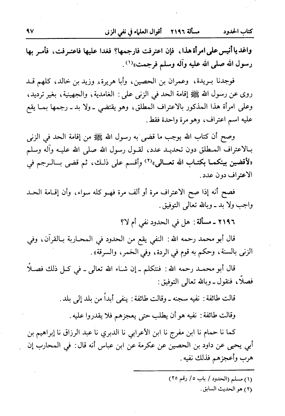 2196 - مَسْأَلَةٌ: هَلْ فِي الْحُدُودِ نَفْيٌ أَمْ لَا؟ قَالَ أَبُو مُحَمَّدٍ - رَحِمَهُ اللَّهُ -: النَّفْيُ يَقَعُ مِنْ الْحُدُودِ فِي الْمُحَارَبَةِ بِالْقُرْآنِ، وَفِي الزِّنَى بِالسُّنَّةِ، وَحَكَمَ بِهِ قَوْمٌ فِي الرِّدَّةِ، وَفِي الْخَمْرِ، وَالسَّرِقَةِ "
