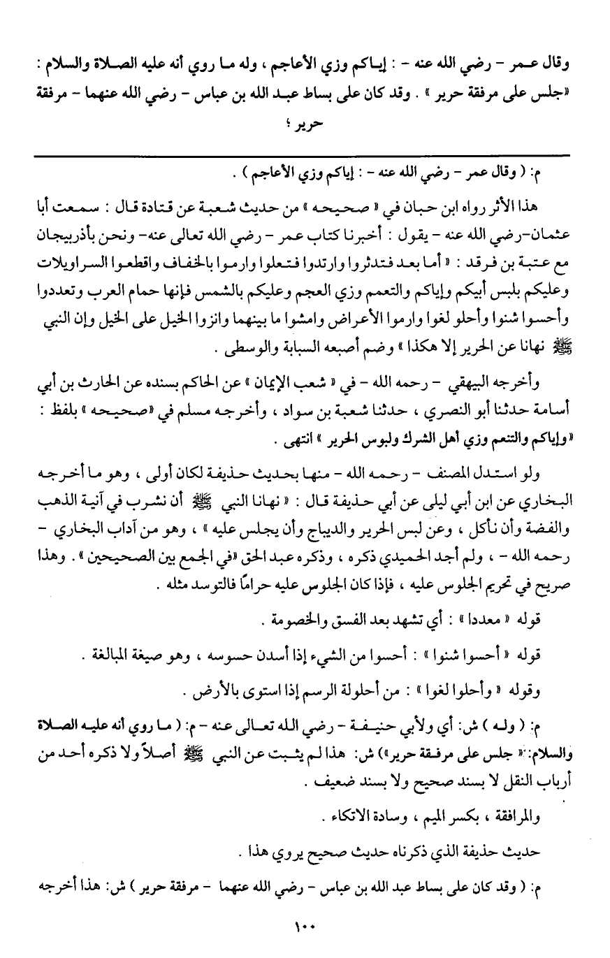 وقال عمر - رَضِيَ اللَّهُ عَنْهُ -: إياكم وزي الأعاجم، وله ما روي أنه - عَلَيْهِ الصَّلَاةُ وَالسَّلَامُ -: «جلس على مرفقة حرير» . وقد كان على بساط عبد الله بن عباس - رَضِيَ اللَّهُ عَنْهُمَا - مرفقة حرير؛