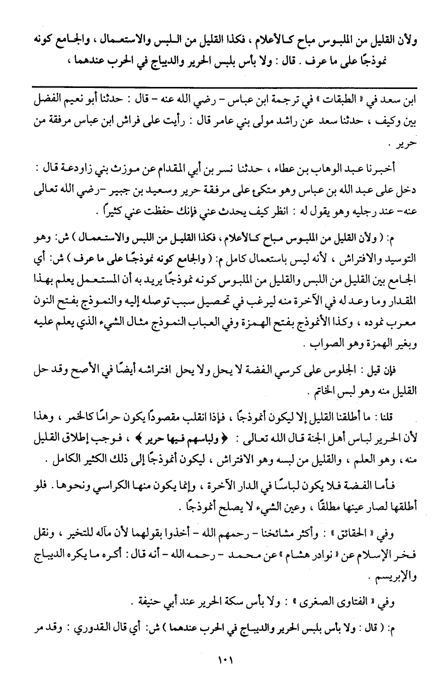 ـــــــــــــــــــــــــــــQابن سعد في " الطبقات " في ترجمة ابن عباس - رَضِيَ اللَّهُ عَنْهُ - قال: حدثنا أبو نعيم الفضل بن دكين، حدثنا سعد عن راشد مولى بني عامر قال: رأيت على فراش ابن عباس مرفقة من حرير.