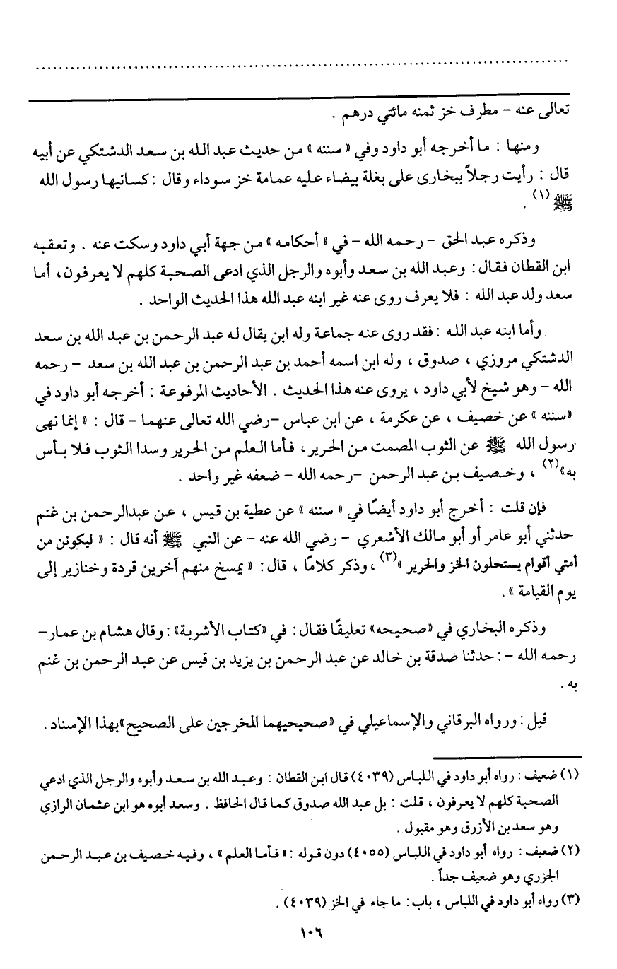 وأما ابنه عبد الله: فقال روى عنه جماعة وله ابن يقال له عبد الرحمن بن عبد الله بن سعد الدشتكي مروزي، صدوق، وله ابن اسمه أحمد بن عبد الرحمن بن عبد الله بن سعد - رَحِمَهُ اللَّهُ - وهو شيخ لأبي داود، يروى عنه هذا الحديث. الأحاديث المرفوعة: أخرجه أبو داود في " سننه " عن خصيف، عن عكرمة، عن ابن عباس - رَضِيَ اللَّهُ تَعَالَى عَنْهُمَا - قال: «إنما نهى رسول الله - صَلَّى اللَّهُ عَلَيْهِ وَسَلَّمَ - عن الثوب المصمت من الحرير، فأما العلم من الحرير، وسدا الثوب فلا بأس به» ، وخصيف بن عبد الرحمن - رَحِمَهُ اللَّهُ - ضعفه غير واحد.