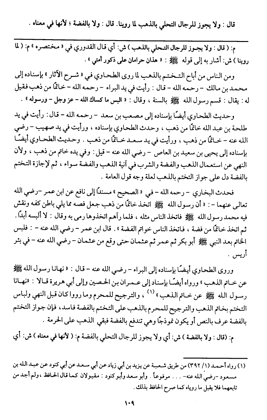قال: ولا يجوز للرجال التحلي بالذهب لما روينا. قال: ولا بالفضة؛ لأنها في معناه.