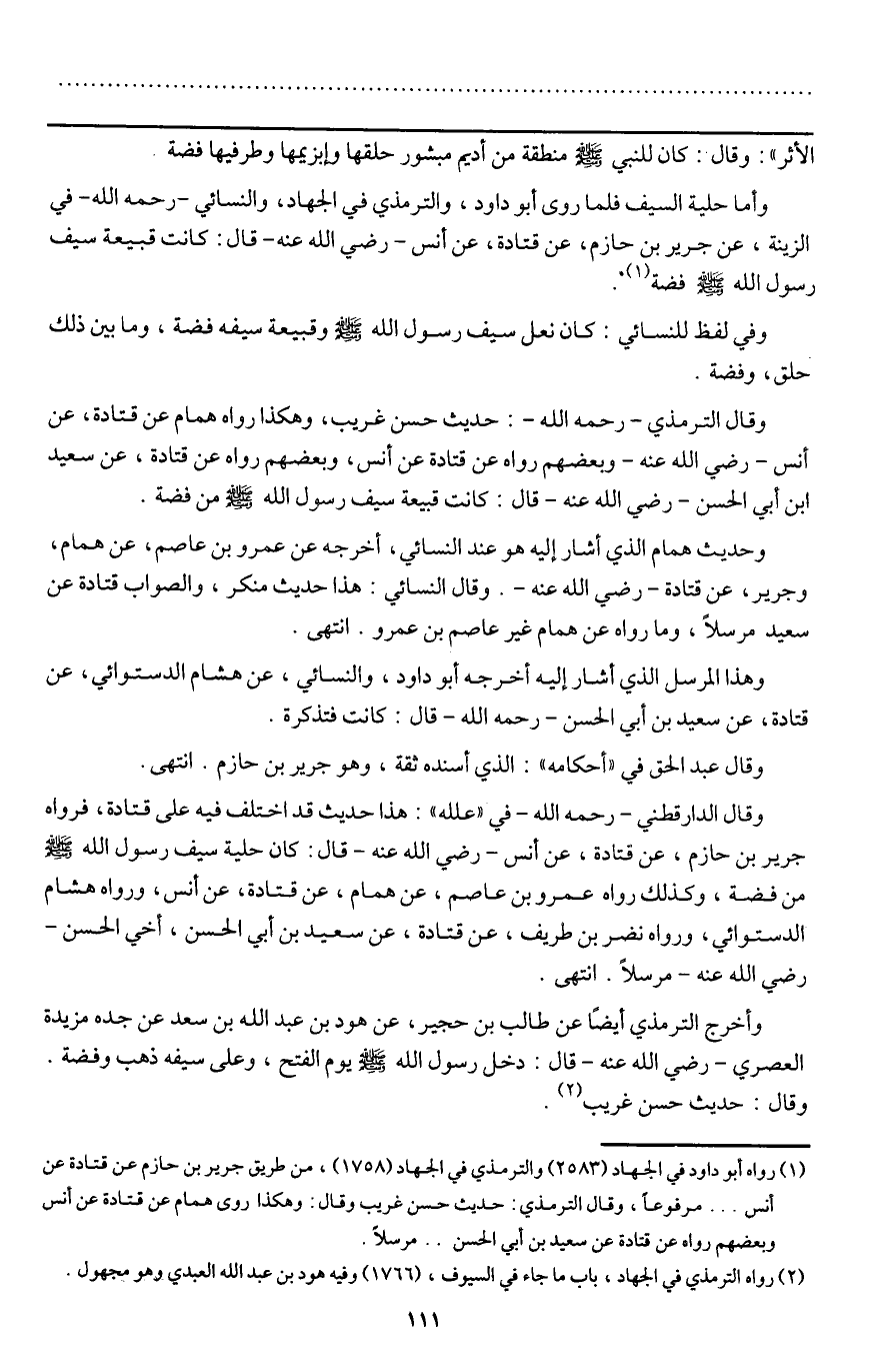 وقال الترمذي - رَحِمَهُ اللَّهُ -: حديث حسن غريب، وهكذا رواه همام عن قتادة، عن أنس - رَضِيَ اللَّهُ عَنْهُ - وبعضهم رواه عن قتادة عن أنس، وبعضهم رواه عن قتادة، عن سعيد بن أبي الحسن - رَضِيَ اللَّهُ عَنْهُ - قال: «كانت قبيعة سيف رسول الله - صَلَّى اللَّهُ عَلَيْهِ وَسَلَّمَ - من فضة» .