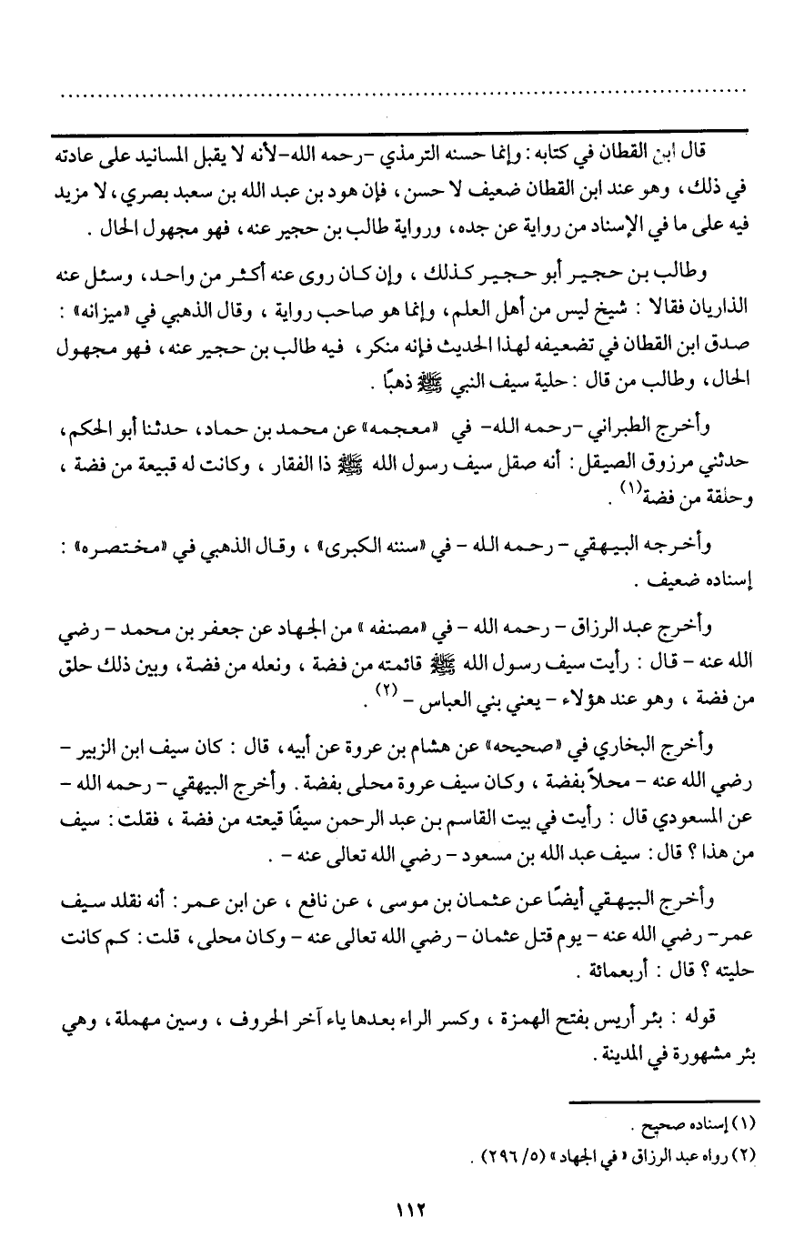 وأخرج البيهقي أيضا عن عثمان بن موسى، عن نافع، عن ابن عمر: أنه تقلد سيف عمر - رَضِيَ اللَّهُ عَنْهُ - يوم قتل عثمان - رَضِيَ اللَّهُ تَعَالَى عَنْهُ - وكان محلى، قلت: كما كانت حليته؟ قال: أربعمائة.