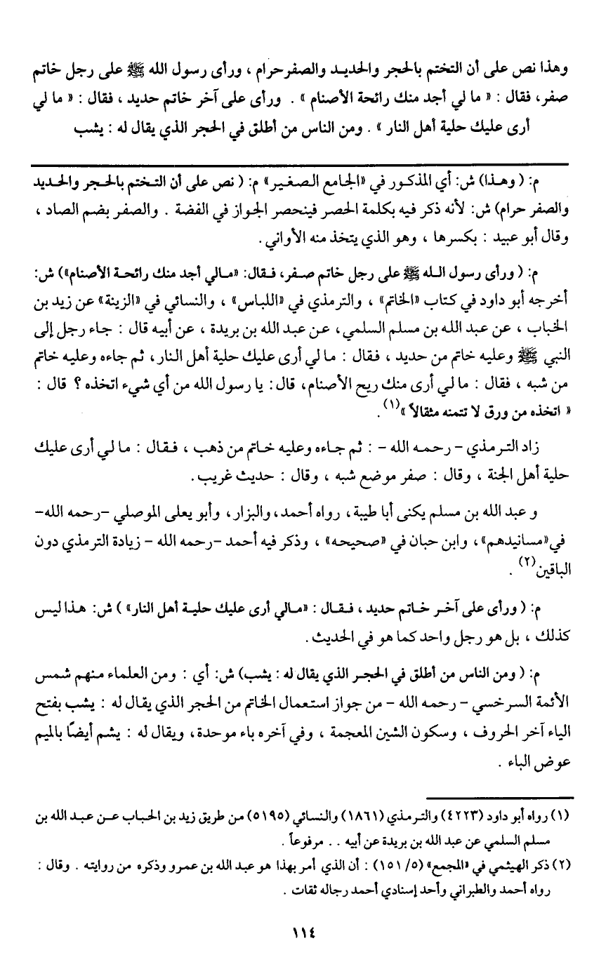 وهذا نص على أن التختم بالحجر والحديد والصفر حرام، «ورأى رسول الله - صَلَّى اللَّهُ عَلَيْهِ وَسَلَّمَ - على رجل خاتم صفر، فقال: " ما لي أجد منك رائحة الأصنام ". ورأى على آخر خاتم حديد " فقال: " ما لي أرى عليك حلية أهل النار» . ومن الناس من أطلق في الحجر الذي يقال له: يشب