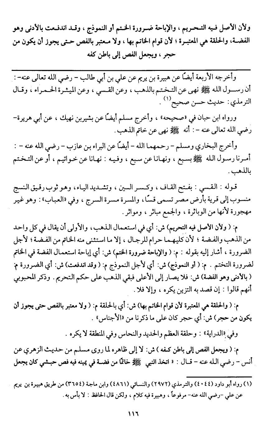 ـــــــــــــــــــــــــــــQوأخرجه الأربعة أيضا عن هبيرة بن يريم عن علي بن أبي طالب - رَضِيَ اللَّهُ تَعَالَى عَنْهُ -: «أن رسول الله - صَلَّى اللَّهُ عَلَيْهِ وَسَلَّمَ - نهى عن التختم بالذهب، وعن القسي، وعن الميثرة الحمراء» وقال الترمذي: حديث حسن صحيح.