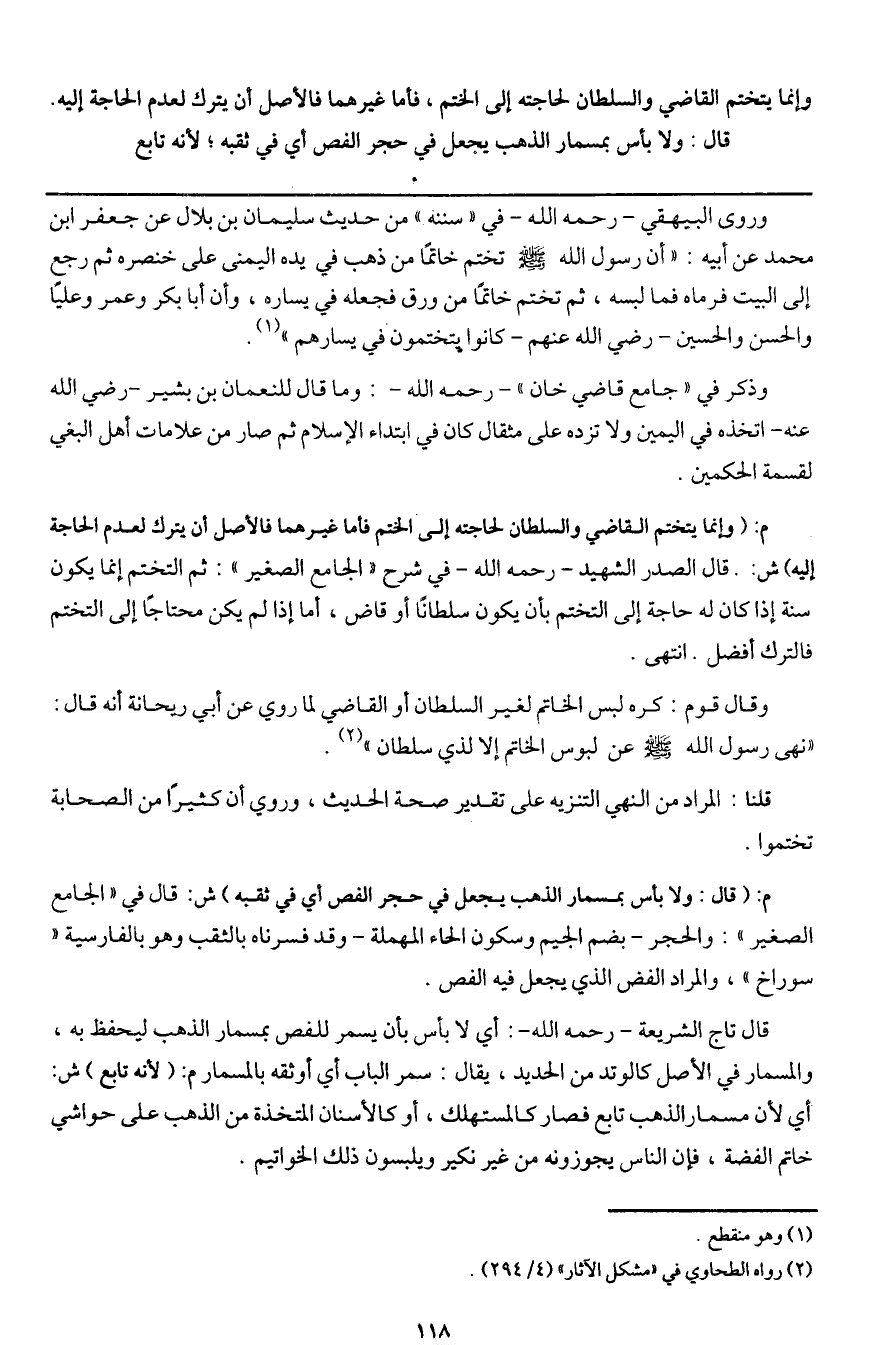 م: (وإنما يتختم القاضي والسلطان لحاجته إلى الختم فأما غيرهما فالأصل أن يترك لعدم الحاجة إليه) ش: قال الصدر الشهيد - رَحِمَهُ اللَّهُ - في شرح " الجامع الصغير ": ثم التختم إنما يكون سنة إذا كان له حاجة إلى التختم بأن يكون سلطانا أو قاض، أما إذا لم يكن محتاجا إلى التختم فالترك أفضل. انتهى.