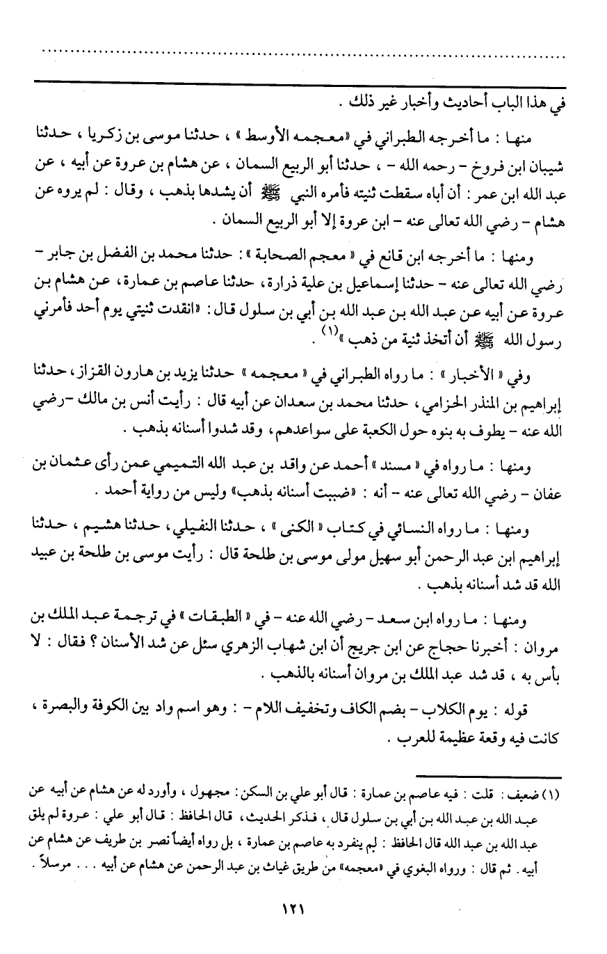 منها: ما أخرجه الطبراني في " معجمه الأوسط "، حدثنا موسى بن زكريا، حدثنا شيبان بن فروخ - رَحِمَهُ اللَّهُ -، حدثنا أبو الربيع السمان، عن هشام بن عروة عن أبيه، «عن عبد الله بن عمر: أن أباه سقطت ثنيته فأمره النبي - صَلَّى اللَّهُ عَلَيْهِ وَسَلَّمَ - أن يشدها بذهب» وقال: لم يروه عن هشام - رَضِيَ اللَّهُ تَعَالَى عَنْهُ - ابن عروة إلا أبو الربيع السمان.