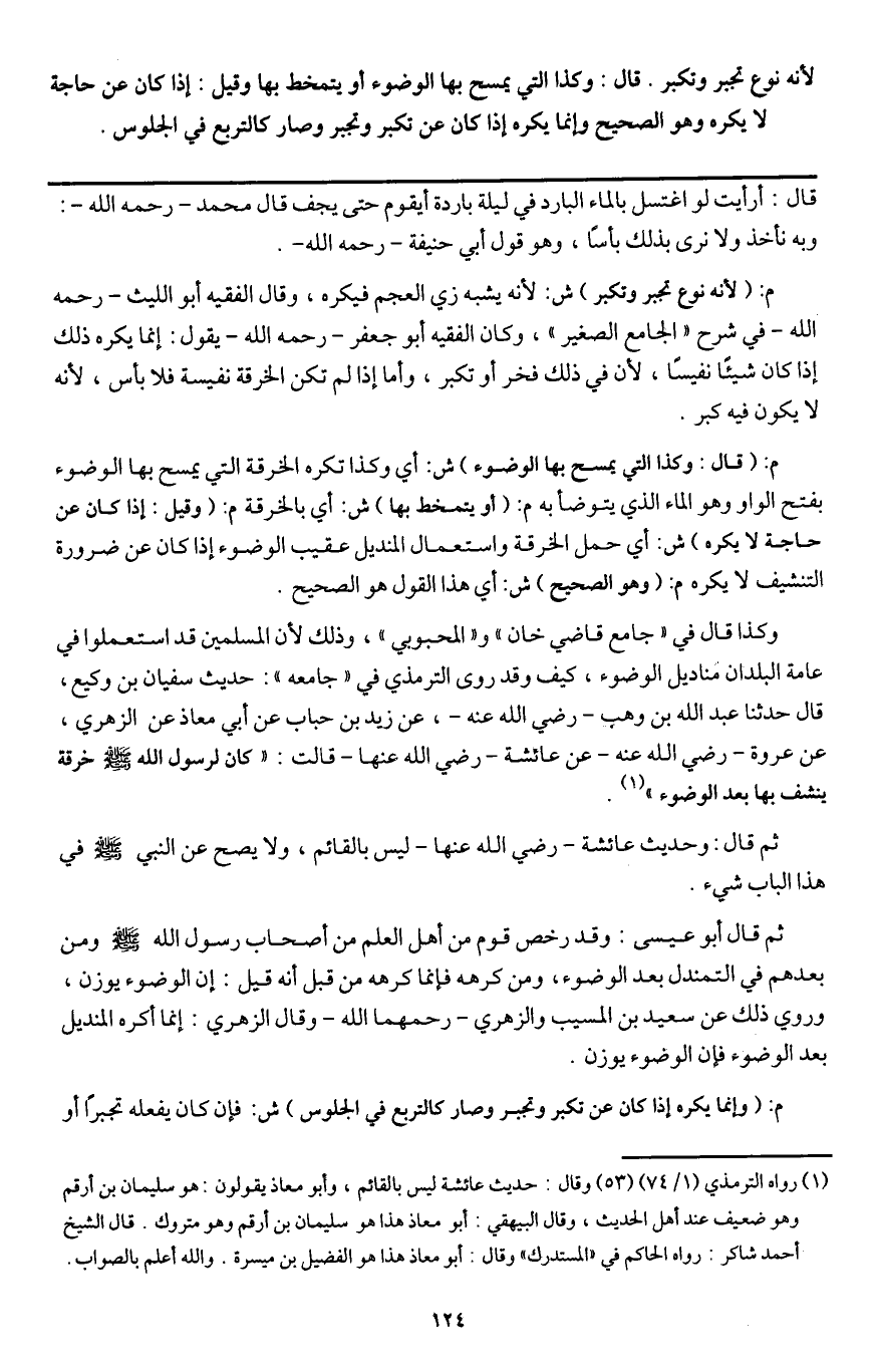 وكذا قال في " جامع قاضي خان " و " المحبوبي "، وذلك لأن المسلمين قد استعملوا في عامة البلدان مناديل الوضوء، كيف وقد روى الترمذي في " جامعه ": حديث سفيان بن وكيع، قال حدثنا عبد الله بن وهب - رَضِيَ اللَّهُ عَنْهُ -، عن زيد بن حباب عن أبي معاذ عن الزهري، عن عروة - رَضِيَ اللَّهُ عَنْهُ - عن عائشة - رَضِيَ اللَّهُ عَنْهَا - قالت: «كان لرسول الله - صَلَّى اللَّهُ عَلَيْهِ وَسَلَّمَ - خرقة ينشف بها بعد الوضوء» .