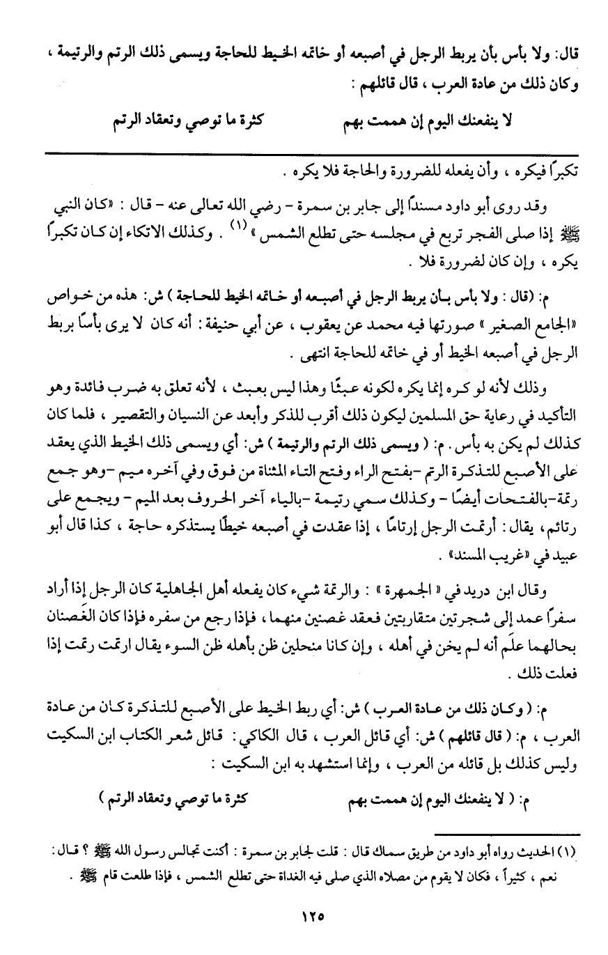 قال: ولا بأس بأن يربط الرجل في أصبعه أو خاتمه الخيط للحاجة ويسمى ذلك الرتم والرتيمة، وكان ذلك من عادة العرب، قال قائلهم: