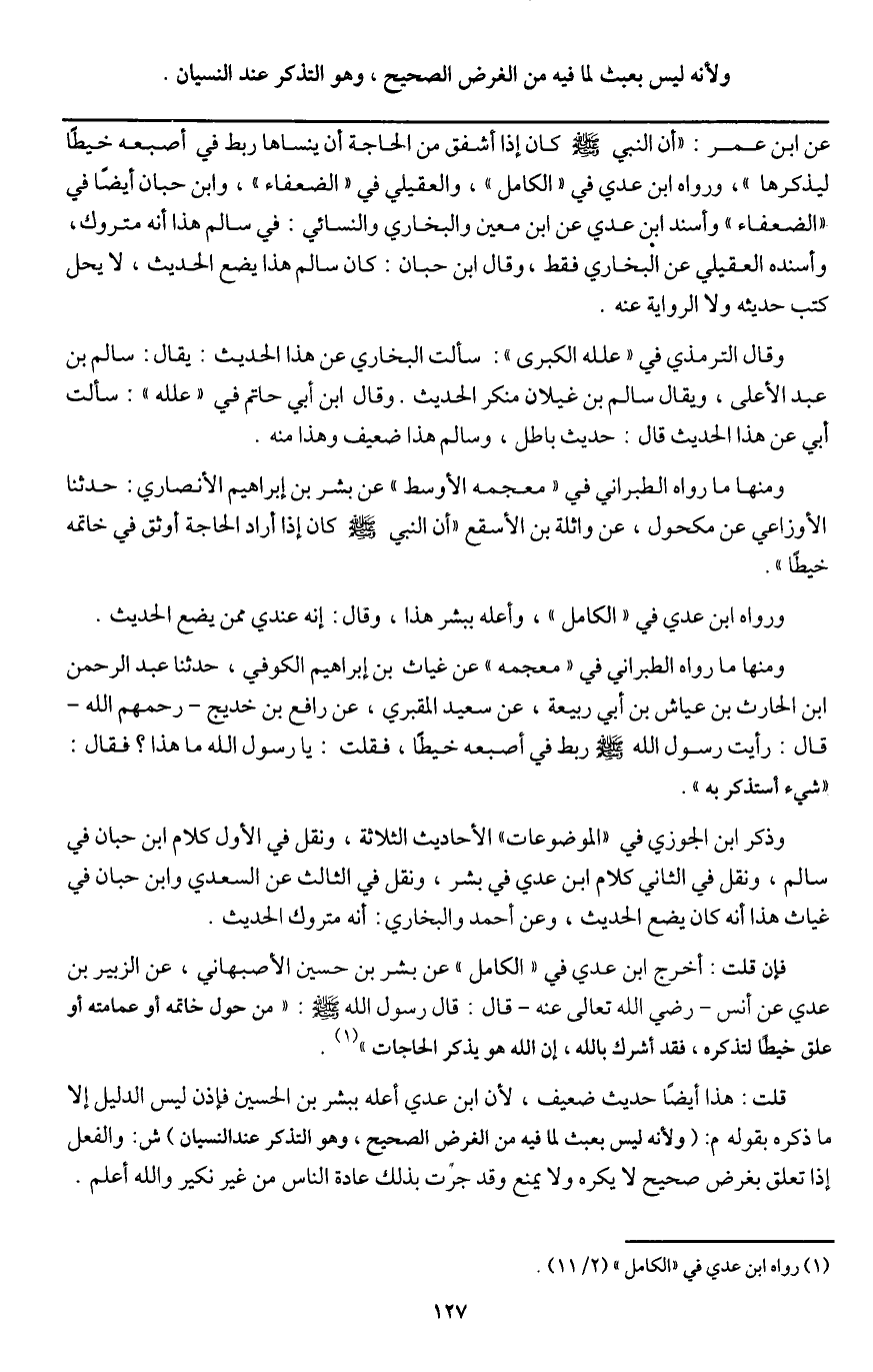 ـــــــــــــــــــــــــــــQعن ابن عمر: «أن النبي - صَلَّى اللَّهُ عَلَيْهِ وَسَلَّمَ - كان إذا أشفق من الحاجة أن ينساها ربط في أصبعه خيطا ليذكرها» ، ورواه ابن عدي في " الكامل "، والعقيلي في " الضعفاء "، وابن حبان أيضا في " الضعفاء " وأسند ابن عدي عن ابن معين والبخاري والنسائي: في سالم هذا أنه متروك، وأسنده العقيلي عن البخاري فقط، وقال ابن حبان: كان سالم هذا يضع الحديث، لا يحل كتب حديثه ولا الرواية عنه.
