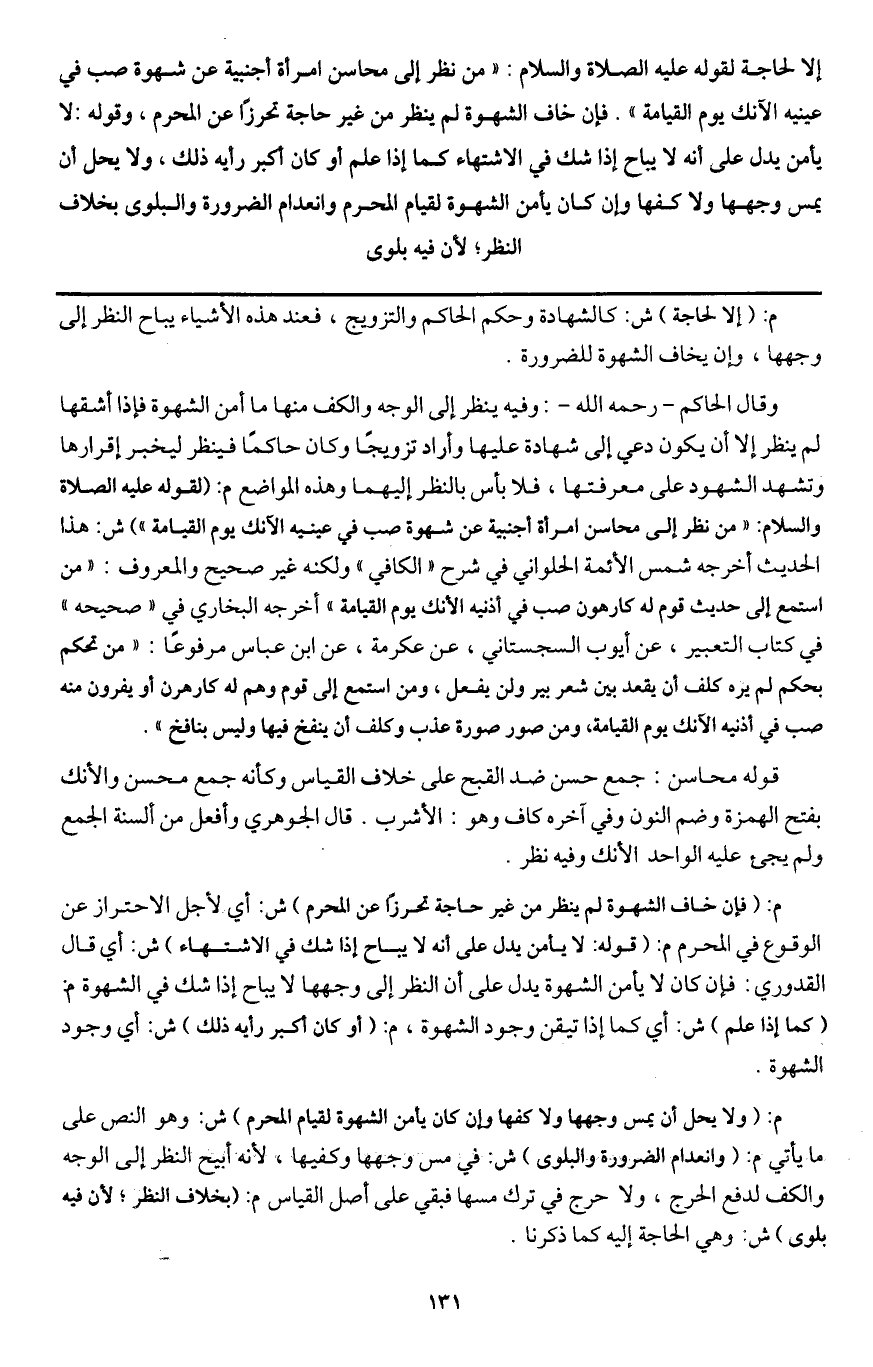 ـــــــــــــــــــــــــــــQم: (إلا لحاجة) ش: كالشهادة وحكم الحاكم والتزويج، فعند هذه الأشياء يباح النظر إلى وجهها، وإن يخاف الشهوة للضرورة.