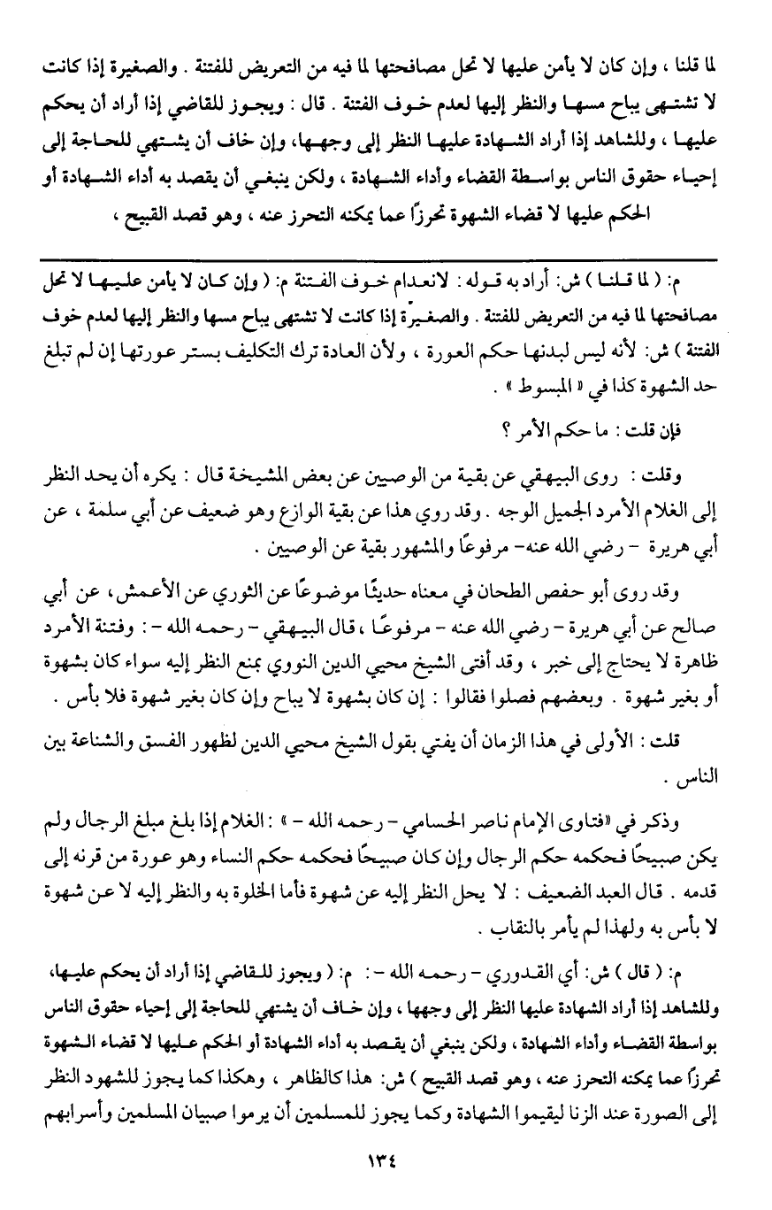 قال: ويجوز للقاضي إذا أراد أن يحكم عليها، وللشاهد إذا أراد الشهادة عليها النظر إلى وجهها، وإن خاف أن يشتهي للحاجة إلى إحياء حقوق الناس بواسطة القضاء وأداء الشهادة، ولكن ينبغي أن يقصد به أداء الشهادة أو الحكم عليها لا قضاء الشهوة تحرزا عما يمكنه التحرز عنه، وهو قصد القبيح،