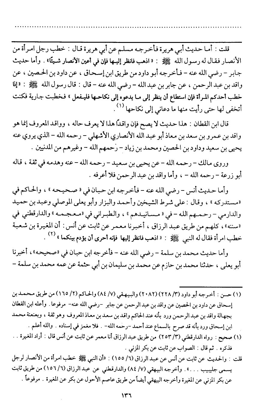 ـــــــــــــــــــــــــــــQقلت: أما حديث أبي هريرة فأخرجه مسلم عن أبي هريرة قال: «خطب رجل امرأة من الأنصار فقال له رسول الله - صَلَّى اللَّهُ عَلَيْهِ وَسَلَّمَ -: "اذهب فانظر إلهيا فإن في أعين الأنصار شيئا» . وأما حديث جابر - رَضِيَ اللَّهُ عَنْهُ - فأخرجه أبو داود من طريق ابن إسحاق، عن داود بن الحصين، عن واقد بن عبد الرحمن، «عن جابر بن عبد الله - رَضِيَ اللَّهُ عَنْهُ - قال: قال رسول الله - صَلَّى اللَّهُ عَلَيْهِ وَسَلَّمَ -: "إذا خطب أحدكم المرأة فإن استطاع أن ينظر إلى ما يدعوه إلى نكاحها فليفعل" فخطبت جارية فكنت أتخفى لها حتى رأيت منها ما دعاني إلى نكاحها» .