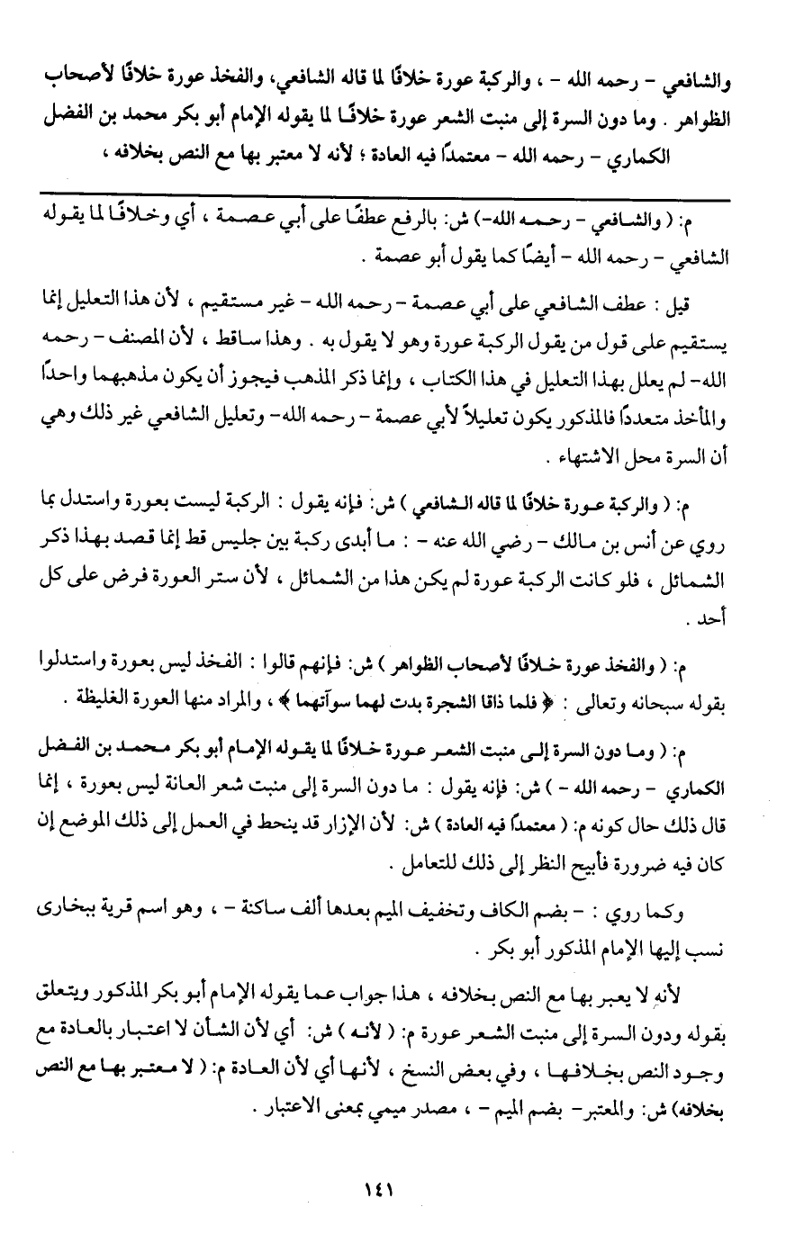 والفخذ عورة خلافا لأصحاب الظواهر. وما دون السرة إلى منبت الشعر عورة خلافا لما يقوله الإمام أبو بكر محمد بن الفضل الكماري - رَحِمَهُ اللَّهُ - معتمدا فيه العادة؛ لأنه لا معتبر بها مع النص بخلافه.