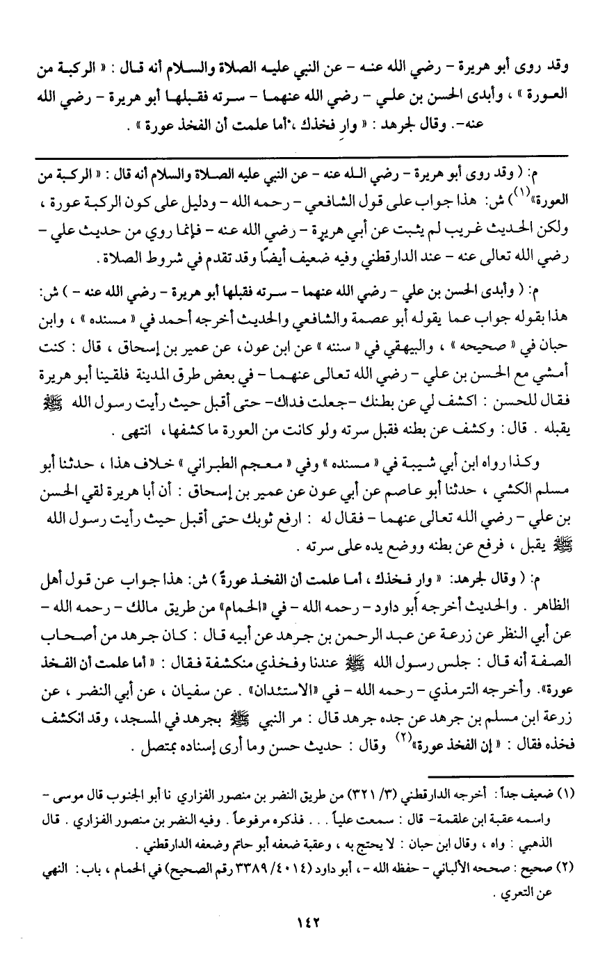 وقد روى أبو هريرة - رَضِيَ اللَّهُ عَنْهُ - عن النبي - عَلَيْهِ الصَّلَاةُ وَالسَّلَامُ - أنه قال: «الركبة من العورة» ، وأبدى الحسن بن علي - رَضِيَ اللَّهُ عَنْهُمَا - سرته فقبلها أبو هريرة - رَضِيَ اللَّهُ عَنْهُ -. وقال لجرهد: «وار فخذك، أما علمت أن الفخذ عورة» .