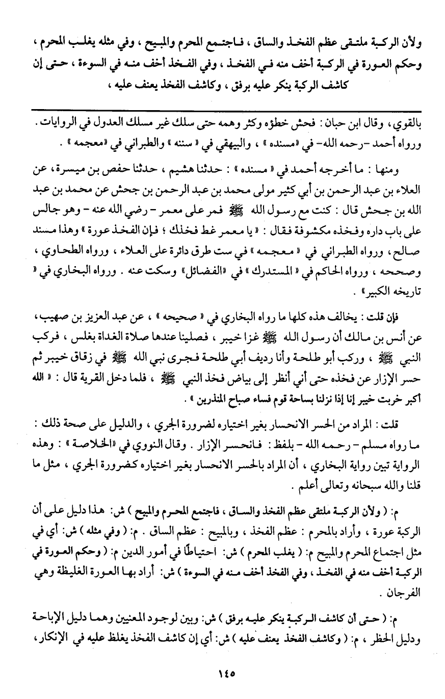 ومنها: ما أخرجه أحمد في "مسنده ": حدثنا هشيم، حدثنا حفص بن ميسرة، عن العلاء بن عبد الرحمن بن أبي كثير مولى محمد بن عبد الرحمن بن جحش «عن محمد بن عبد الله بن جحش قال: كنت مع رسول الله - صَلَّى اللَّهُ عَلَيْهِ وَسَلَّمَ - فمر على معمر - رَضِيَ اللَّهُ عَنْهُ - وهو جالس على باب داره وفخذه مكشوفة فقال: "يا معمر غط فخذك؛ فإن الفخذ عورة» وهذا مسند صالح، ورواه الطبراني في "معجمه " في ست طرق دائرة على العلاء، ورواه الطحاوي، وصححه، ورواه الحاكم في "المستدرك " في "الفضائل" وسكت عنه. ورواه البخاري في "تاريخه الكبير ".