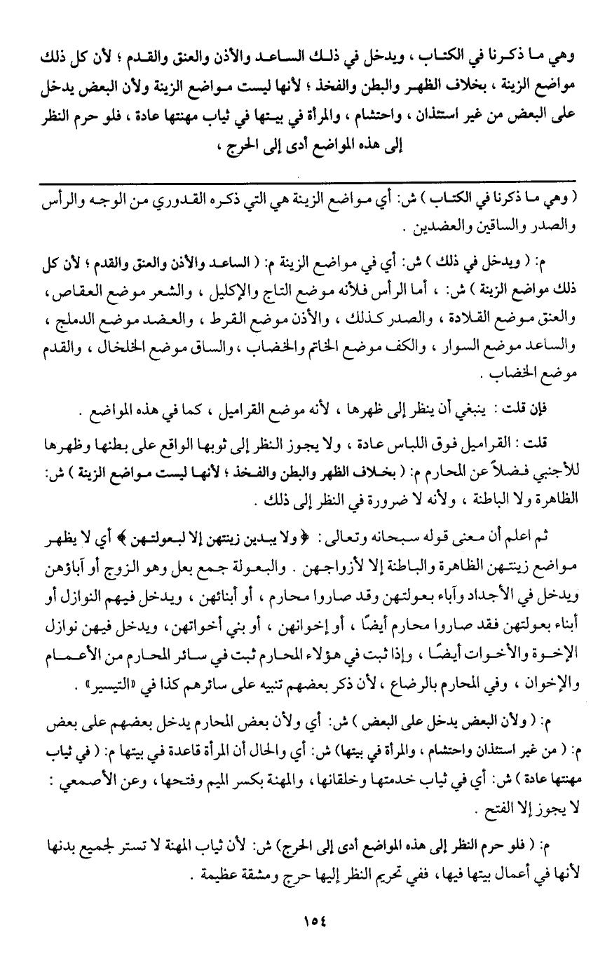 ثم اعلم أن معنى قوله سبحانه وتعالى: {وَلَا يُبْدِينَ زِينَتَهُنَّ إِلَّا لِبُعُولَتِهِنَّ} [النور: 31] أي لا يظهر مواضع زينتهن الظاهرة والباطنة إلا لأزواجهن. والبعولة جمع بعل وهو الزوج أو آباؤهن ويدخل في الأجداد وآباء بعولتهن وقد صاروا محارم، أو أبنائهن، ويدخل فيهم النوازل أو أبناء بعولتهن فقد صاروا محارم أيضا، أو إخوانهن، أو بني أخواتهن، ويدخل فيهن نوازل الإخوة والأخوات أيضا، وإذا ثبت في هؤلاء المحارم ثبت في سائر المحارم من الأعمام والإخوان، وفي المحارم بالرضاع؛ لأن ذكر بعضهم تنبيه على سائرهم كذا في " التيسير ".