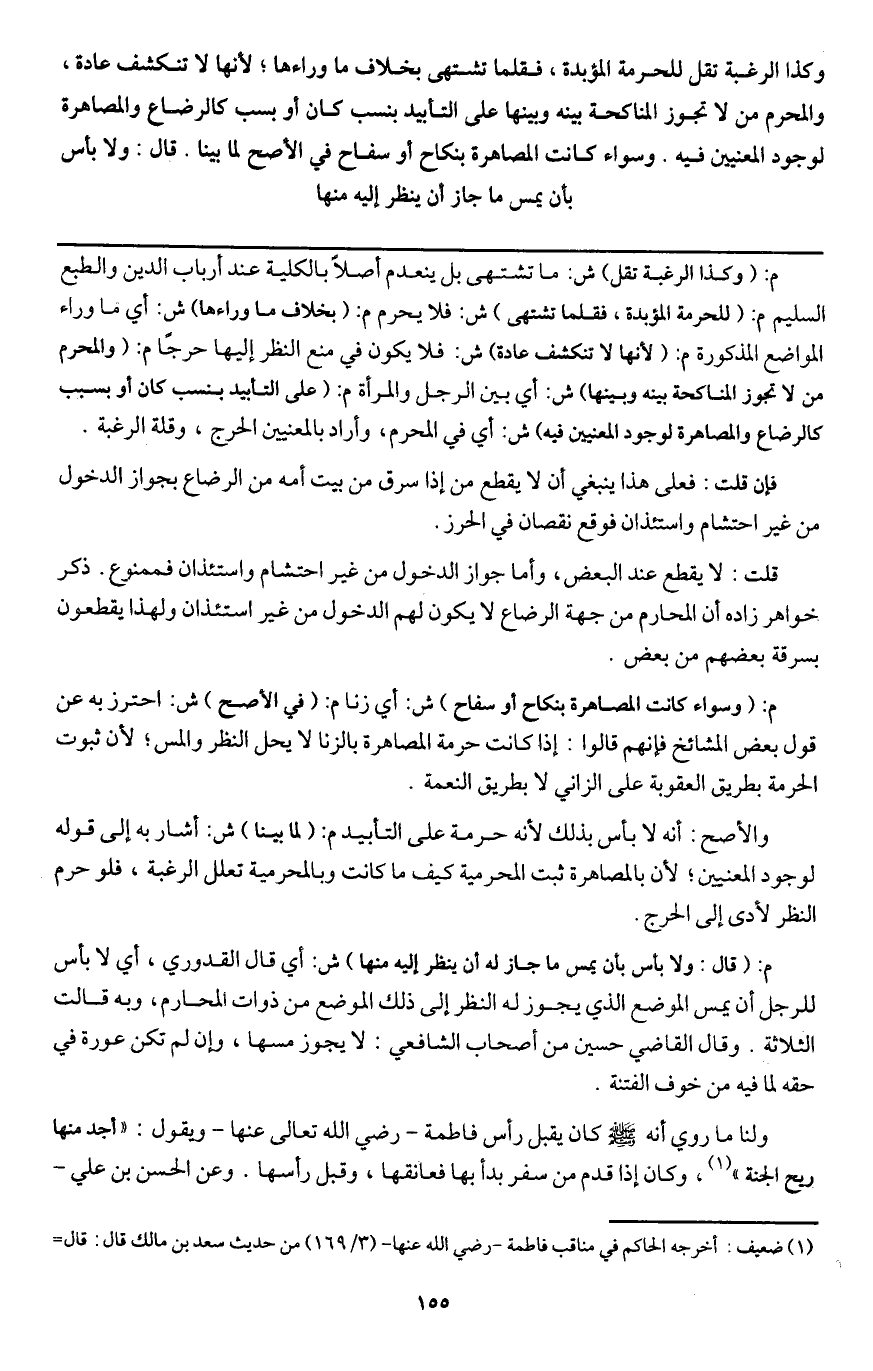 ـــــــــــــــــــــــــــــQم: (وكذا الرغبة تقل) ش: ما تشتهى بل ينعدم أصلا بالكلية عند أرباب الدين والطبع السليم م: (للحرمة المؤبدة، فقلما تشتهى) ش: فلا يحرم م: (بخلاف ما وراءها) ش: أي ما وراء المواضع المذكورة م: (لأنها لا تنكشف عادة) ش: فلا يكون في منع النظر إليها حرجا م: (والمحرم من لا تجوز المناكحة بينه وبينها) ش: أي بين الرجل والمرأة م: (على التأبيد بنسب كان أو بسبب كالرضاع والمصاهرة لوجود المعنيين فيه) ش: أي في المحرم، وأراد بالمعنيين الحرج، وقلة الرغبة.