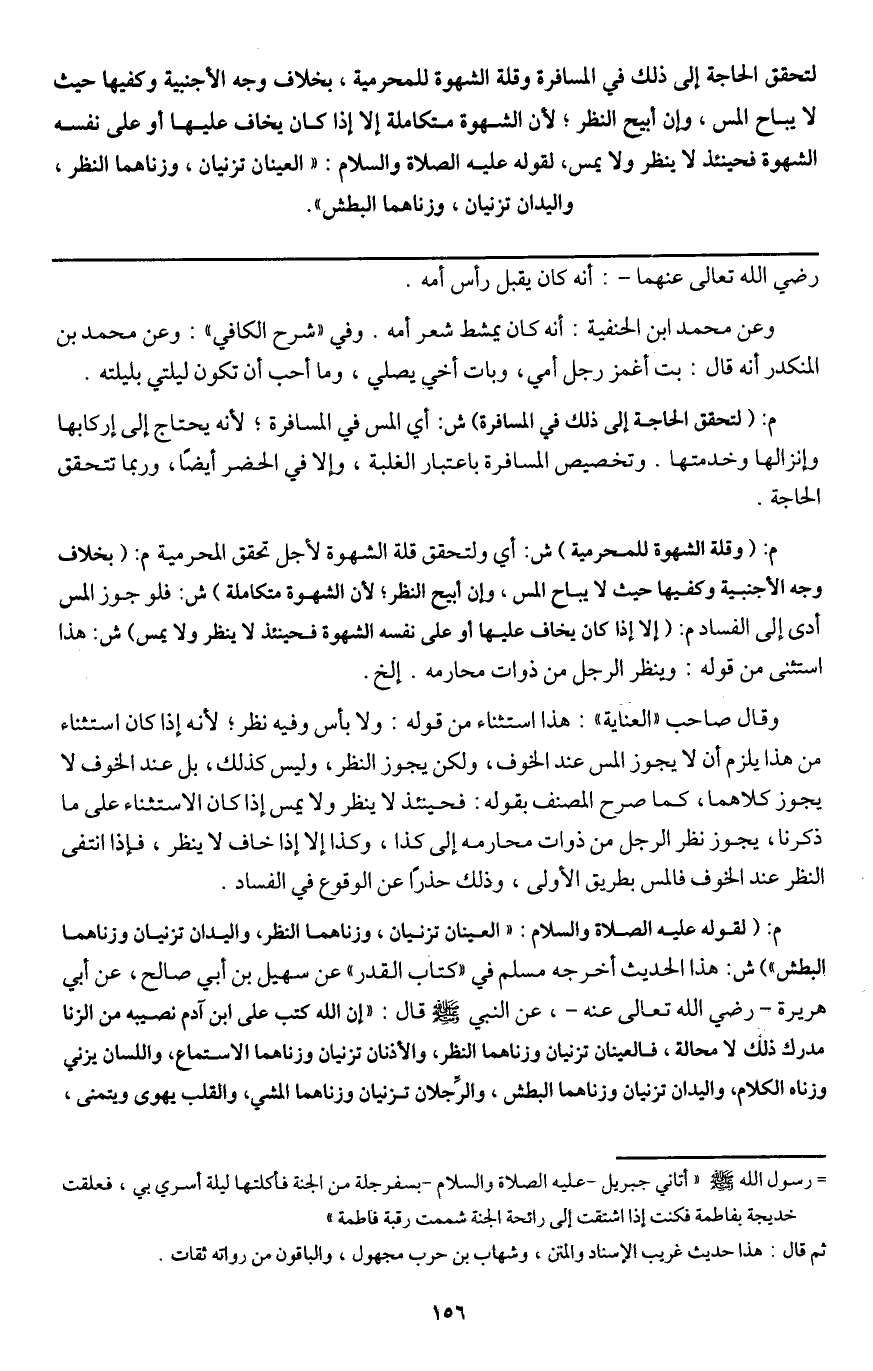 لتحقق الحاجة إلى ذلك في المسافرة وقلة الشهوة للمحرمية، بخلاف وجه الأجنبية وكفيها حيث لا يباح المس، وإن أبيح النظر؛ لأن الشهوة متكاملة إلا إذا كان يخاف عليها أو على نفسه الشهوة فحينئذ لا ينظر ولا يمس، لقوله - عَلَيْهِ الصَّلَاةُ وَالسَّلَامُ -: «العينان تزنيان، وزناهما النظر، واليدان تزنيان، وزناهما البطش» .