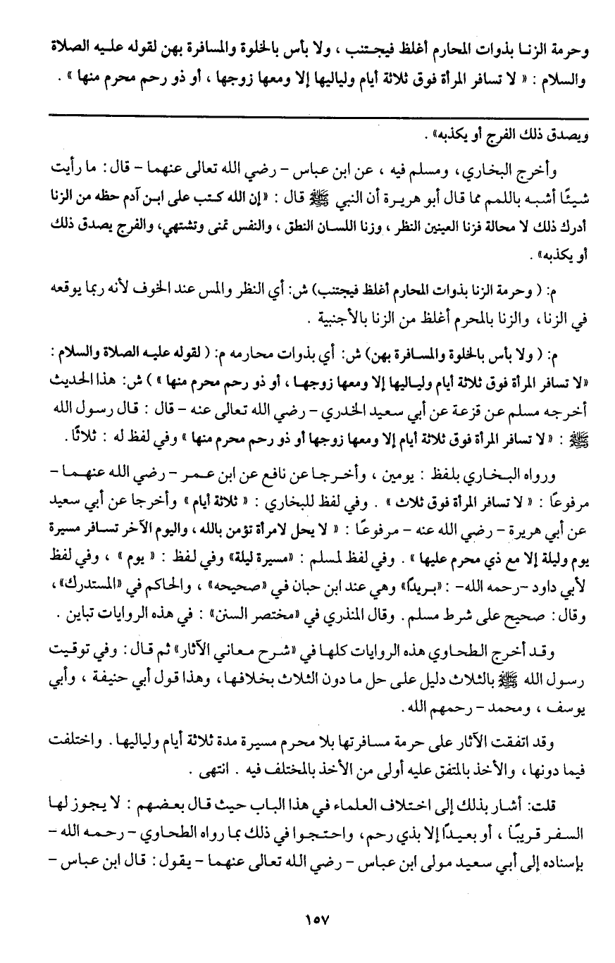 م: (ولا بأس بالخلوة والمسافر بهن) ش: أي بذوات محارمه م: (لقوله - عَلَيْهِ الصَّلَاةُ وَالسَّلَامُ -: «لا تسافر المرأة فوق ثلاثة أيام ولياليها إلا ومعها زوجها، أو ذو رحم محرم منها» ش: هذا الحديث أخرجه مسلم عن قزعة عن أبي سعيد الخدري - رَضِيَ اللَّهُ تَعَالَى عَنْهُ - قال: قال رسول الله - صَلَّى اللَّهُ عَلَيْهِ وَسَلَّمَ -: «لا تسافر المرأة فوق ثلاثة أيام إلا ومعها زوجها أو ذو رحم محرم منها» وفي لفظ له: ثلاثا.