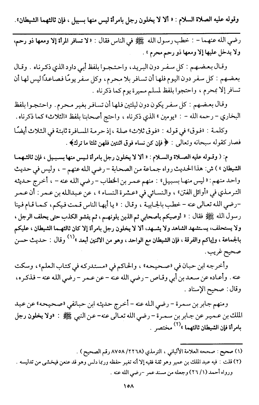 وقوله - عَلَيْهِ الصَّلَاةُ وَالسَّلَامُ -: «ألا لا يخلون رجل بامرأة ليس منها بسبيل، فإن ثالثهما الشيطان» .
