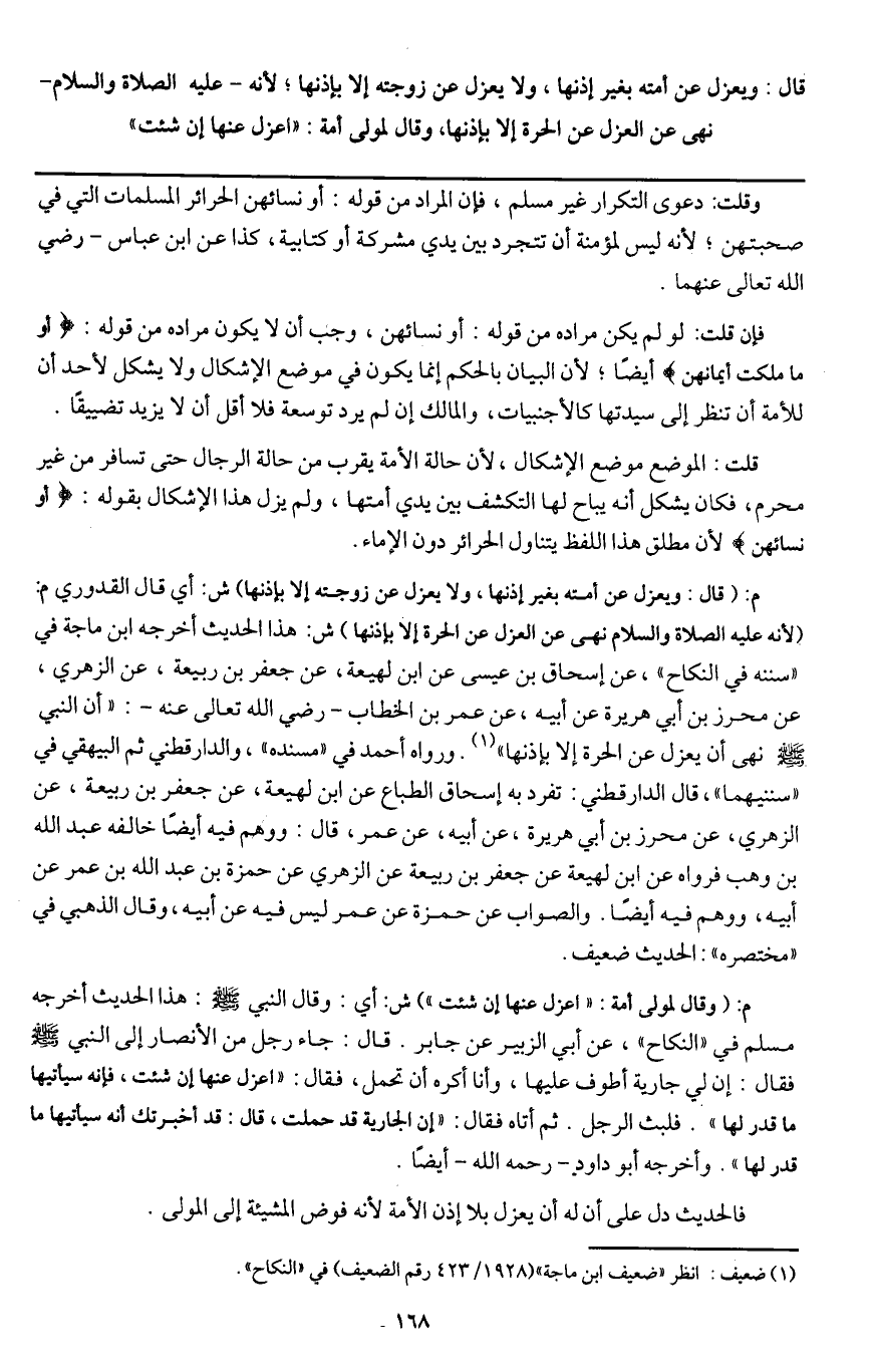 م: (قال: ويعزل عن أمته بغير إذنها، ولا يعزل عن زوجته إلا بإذنها) ش: أي قال القدوري م: (لأنه - عَلَيْهِ الصَّلَاةُ وَالسَّلَامُ - «نهى عن العزل عن الحرة إلا بإذنها» ش: هذا الحديث أخرجه ابن ماجه في "سننه في النكاح"، عن إسحاق بن عيسى عن ابن لهيعة، عن جعفر بن ربيعة، عن الزهري، عن محرز بن أبي هريرة عن أبيه، عن عمر بن الخطاب - رَضِيَ اللَّهُ تَعَالَى عَنْهُ -: «أن النبي - صَلَّى اللَّهُ عَلَيْهِ وَسَلَّمَ - نهى أن يعزل عن الحرة إلا بإذنها» . ورواه أحمد في "مسنده "، والدارقطني ثم البيهقي في "سننيهما"، قال الدارقطني: تفرد به إسحاق الطباع عن ابن لهيعة، عن جعفر بن ربيعة، عن الزهري، عن محرز بن أبي هريرة، عن أبيه، عن عمر، قال: ووهم فيه أيضا خالفه عبد الله بن وهب فرواه عن ابن لهيعة عن جعفر بن ربيعة عن الزهري عن حمزة بن عبد الله بن عمر عن أبيه، ووهم فيه أيضا. والصواب عن حمزة عن عمر ليس فيه عن أبيه، وقال الذهبي في "مختصره ": الحديث ضعيف.