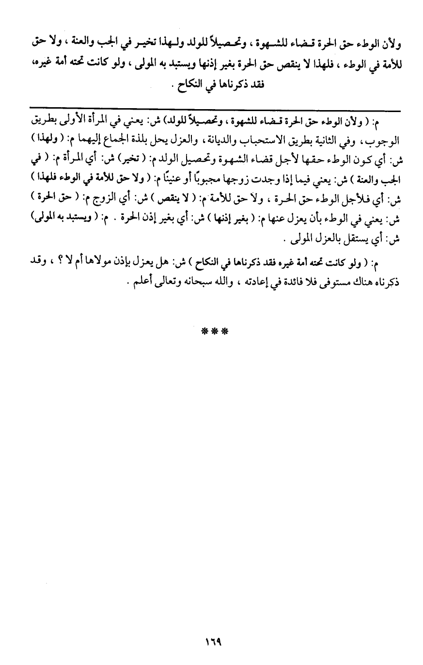 ـــــــــــــــــــــــــــــQم: (ولأن الوطء حق الحرة قضاء للشهوة، وتحصيلا للولد) ش: يعني في المرأة الأولى بطريق الوجوب، وفي الثانية بطريق الاستحباب والديانة، والعزل يحل بلذة الجماع إليهما م: (ولهذا) ش: أي كون الوطء حقها لأجل قضاء الشهوة وتحصيل الولد م: (تخير) ش: أي المرأة م: (في الجب والعنة) ش: يعني فيما إذا وجدت زوجها مجبوبا أو عنينا م: (ولا حق للأمة في الوطء فلهذا) ش: أي فلأجل الوطء حق الحرة، ولا حق للأمة م: (لا ينقص) ش: أي الزوج م: (حق الحرة) ش: يعني في الوطء بأن يعزل عنها م: (بغير إذنها) ش: أي بغير إذن الحرة. م: (ويستبد به المولى) ش: أي يستقل بالعزل المولى.