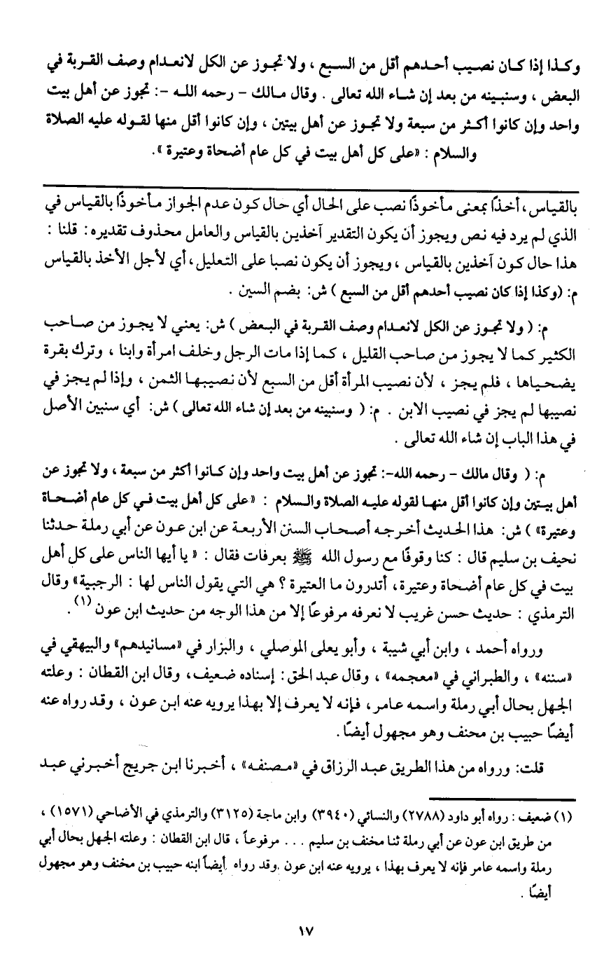 م (وقال مالك - رَحِمَهُ اللَّهُ -: تجوز عن أهل بيت واحد وإن كانوا أكثر من سبعة، ولا تجوز عن أهل بيتين وإن كانوا أقل منها؛ لقوله - عَلَيْهِ الصَّلَاةُ وَالسَّلَامُ -: «على كل أهل بيت في كل عام أضحاة وعتيرة» ش: هذا الحديث أخرجه أصحاب السنن الأربعة عن ابن عون عن أبي رملة حدثنا نحيف بن سليم قال: «كنا وقوفا مع رسول الله - صَلَّى اللَّهُ عَلَيْهِ وَسَلَّمَ - بعرفات فقال: " يا أيها الناس على كل أهل بيت في كل عام أضحاة وعتيرة، أتدرون ما العتيرة؟ هي التي يقول الناس لها: الرجبية» وقال الترمذي: حديث حسن غريب لا نعرفه مرفوعا إلا من هذا الوجه من حديث ابن عون.