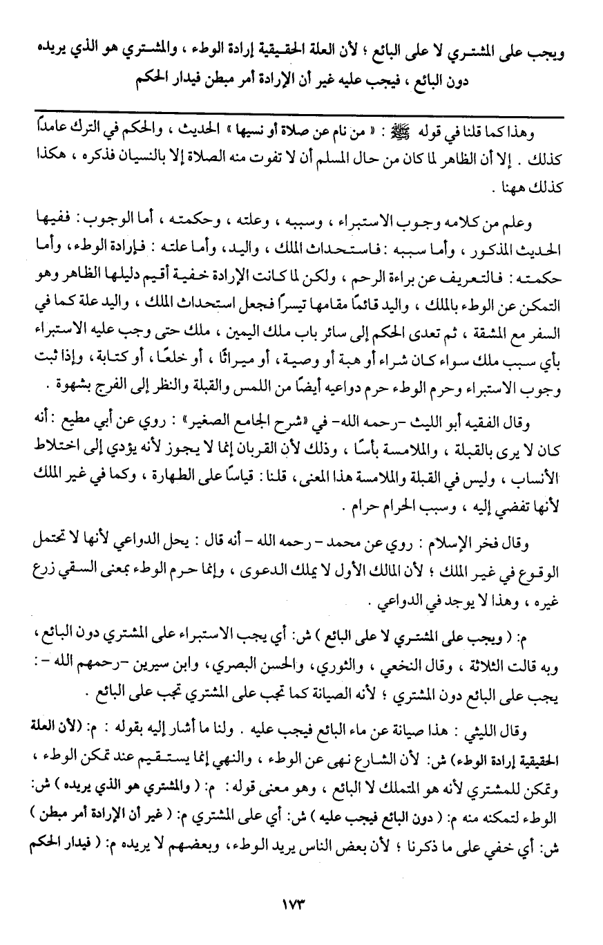وقال الليثي: هذا صيانة عن ماء البائع فيجب عليه. ولنا ما أشار إليه بقوله: م: (لأن العلة الحقيقة إرادة الوطء) ش: لأن الشارع نهى عن الوطء، والنهي إنما يستقيم عند تمكن الوطء، وتمكن للمشتري لأنه هو المتملك لا البائع، وهو معنى قوله: م: (والمشتري هو الذي يريده) ش: الوطء لتمكنه منه م: (دون البائع فيجب عليه) ش: أي على المشتري م: (غير أن الإرادة أمر مبطن) ش: أي خفي على ما ذكرنا؛ لأن بعض الناس يريد الوطء، وبعضهم لا يريده م: (فيدار الحكم
