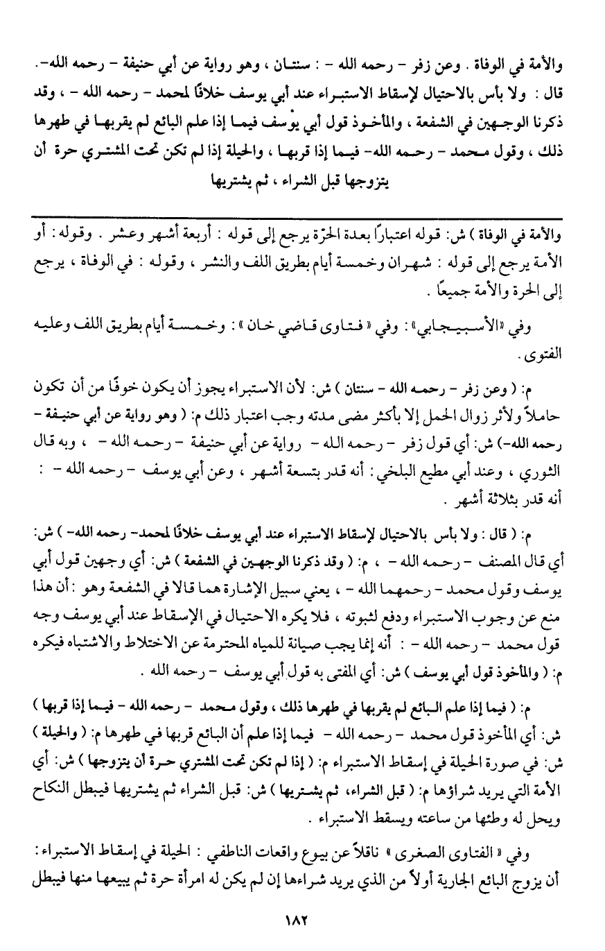 والأمة في الوفاة. وعن زفر - رَحِمَهُ اللَّهُ -: سنتان، وهو رواية عن أبي حنيفة - رَحِمَهُ اللَّهُ -. قال: ولا بأس بالاحتيال لإسقاط الاستبراء عند أبي يوسف خلافا لمحمد - رَحِمَهُ اللَّهُ -، وقد ذكرنا الوجهين في الشفعة، والمأخوذ قول أبي يوسف فيما إذا علم البائع لم يقربها في طهرها ذلك، وقول محمد - رَحِمَهُ اللَّهُ - فيما إذا قربها، والحيلة إذا لم تكن تحت المشتري حرة أن يتزوجها قبل الشراء، ثم يشتريها